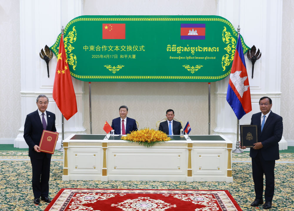 4月17日晚,国家主席习近平同柬埔寨首相洪玛奈在金边和平大厦举行会谈。这是会谈后,两国领导人共同见证中柬双方交换双边合作文本。新华社记者王晔摄