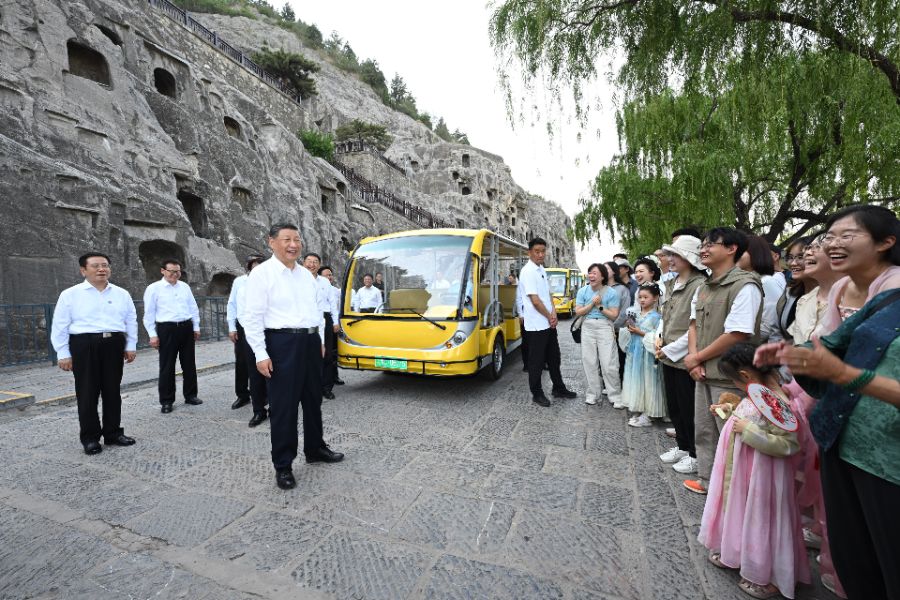 离开龙门石窟之际,总书记伫立草木丰茂的伊水之畔,遥望西山千龛拱列,尽览博大文明气度。粼粼波光的伊水,静静流淌。对岸,北魏的錾痕、盛唐的凿印,崖壁间镌刻着恒久的文明印记。