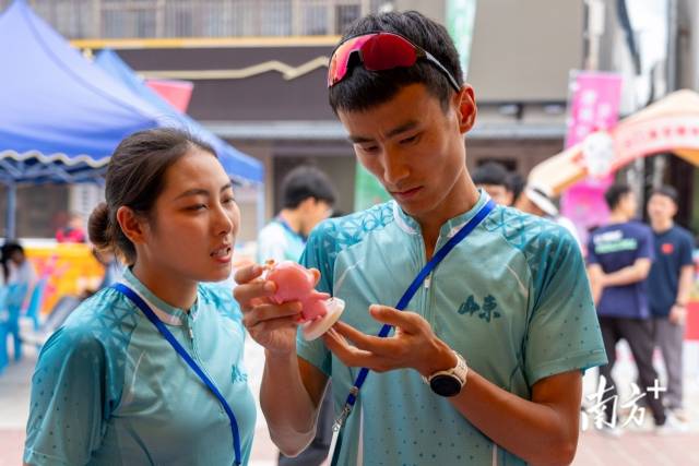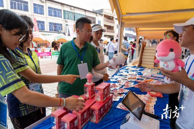 开赛仪式现场特别设置了20个非遗展销摊位,全面展示茂名本地的文化旅游特色,并通过体育问答互动,提升参赛选手和观众的参与感。其中,十五运会官方特许商品的展位最受欢迎,来自全国各地的选手对吉祥物“喜洋洋”和“乐融融”爱不释手,纷纷买下毛绒公仔、冰箱贴等特许商品,把两只可爱的中华白海豚带回家。