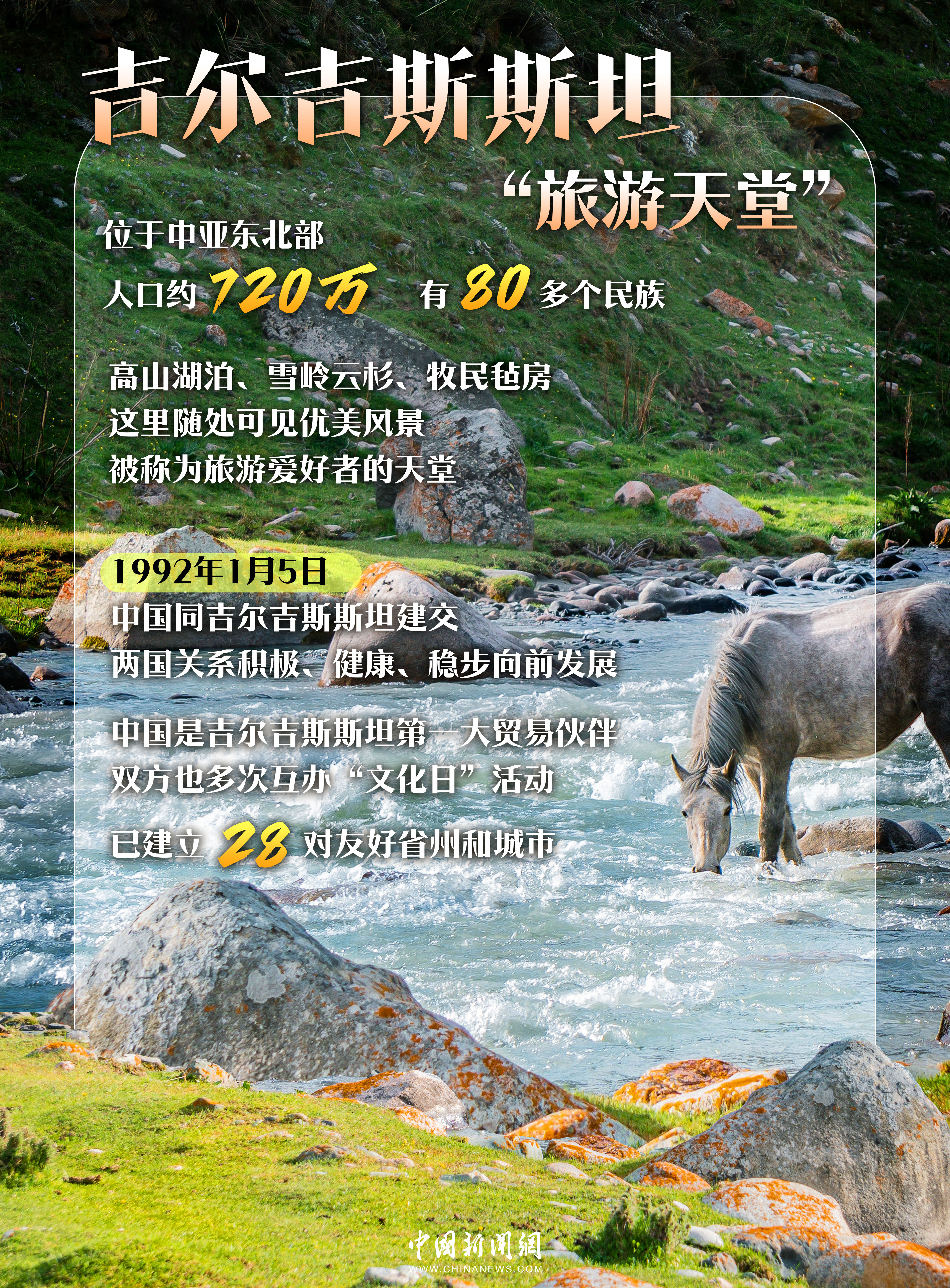 吉尔吉斯斯坦同样自然环境优美,被誉为“中亚小瑞士”,每年吸引着全球上百万游客。