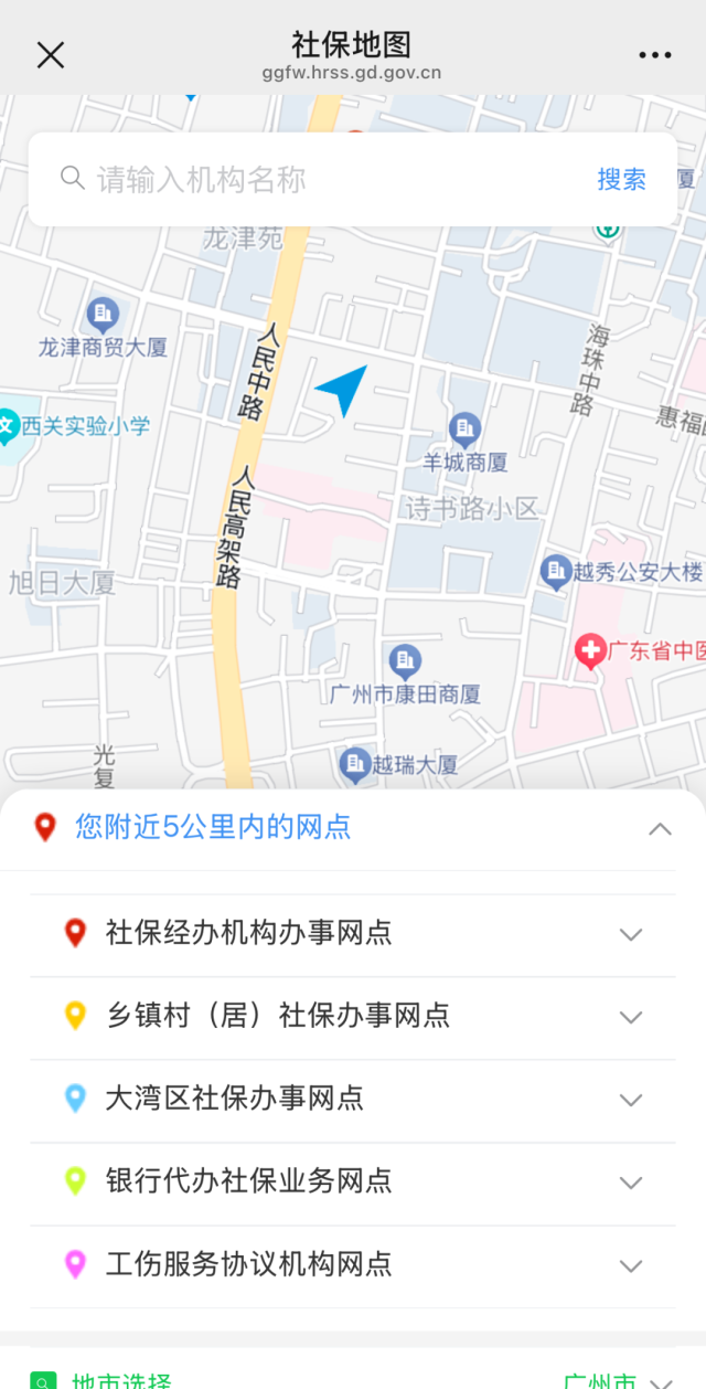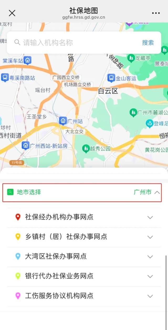 方法二:“社保地图”默认显示您当前所在位置所属地市的社保服务网点,点击【地市选择】一栏并下滑,可根据需要切换城市,从列表分类中选择社保服务网点类型,然后再选择合适的办事网点。