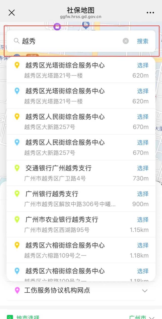 方法三:在最上方的搜索栏,输入您想前往的网点关键字进行搜索,如“越秀”,可从搜索结果中选择合适的办事网点。
