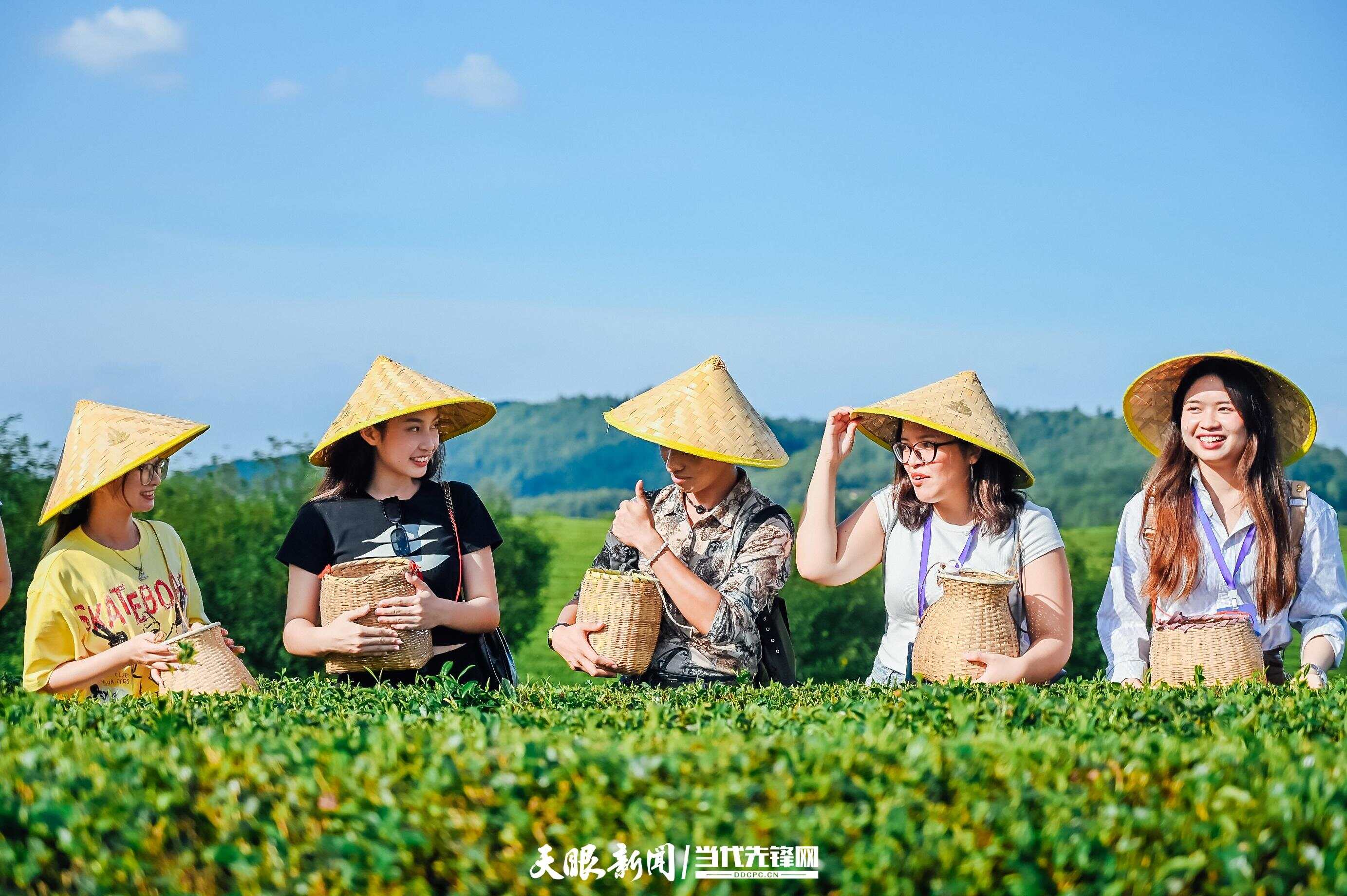 交流团正在湄潭万亩茶海体验采茶