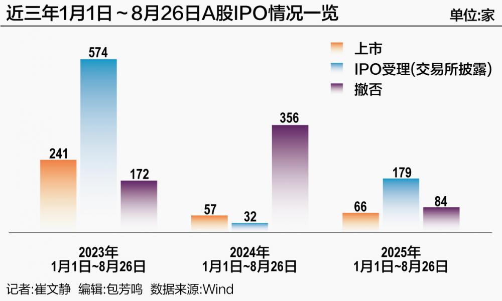 另一方面,IPO受理正在提速。2025年1月1日—8月26日,IPO受理总数达179家,较2024年同期大幅增长459%。与此同时,“撤否”企业数量大幅减少,约为去年同期的两成,显示排队企业整体质量明显提高。