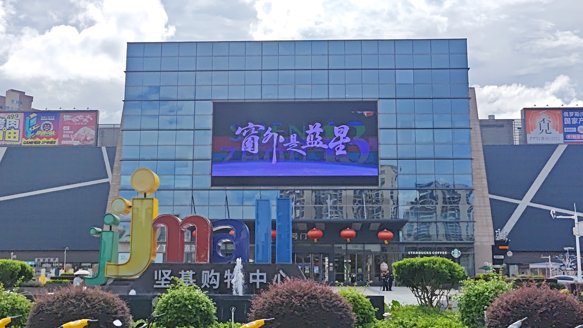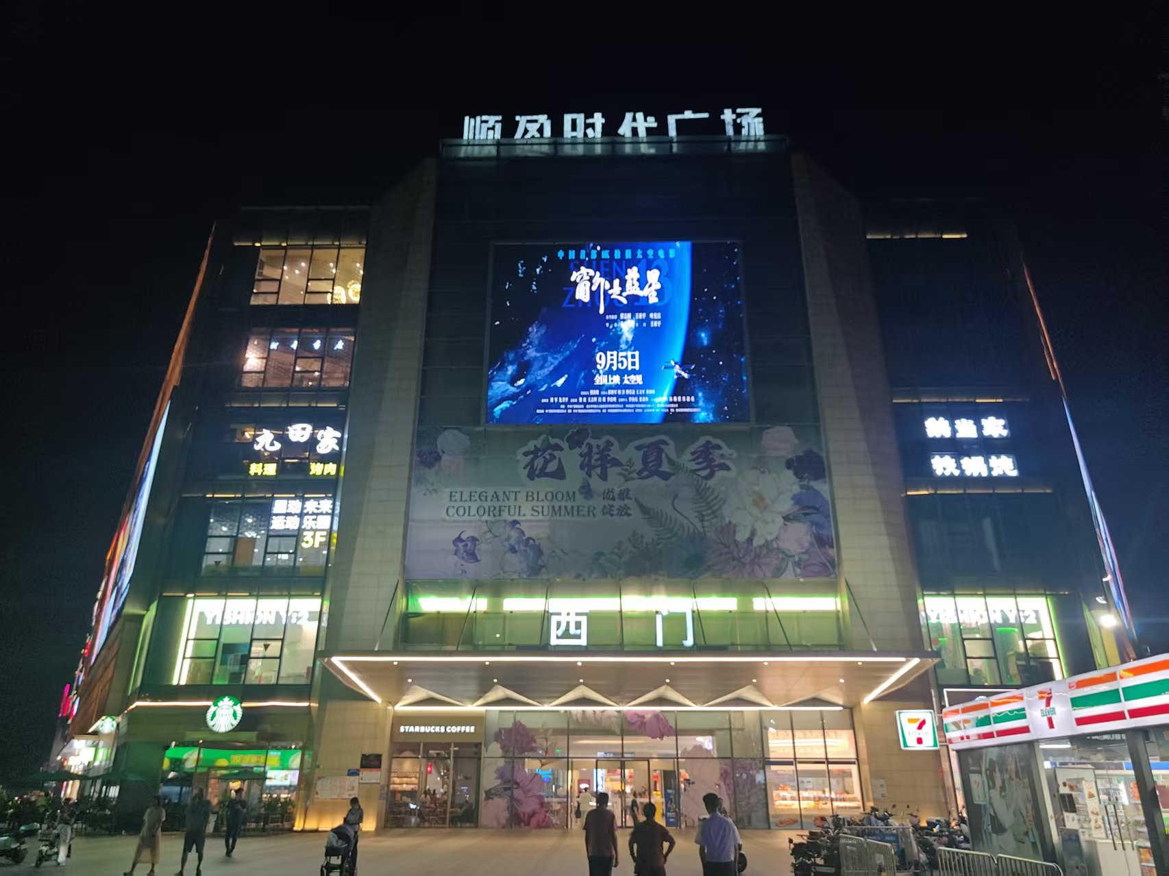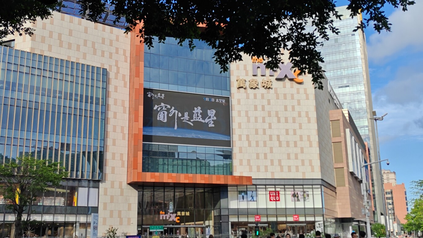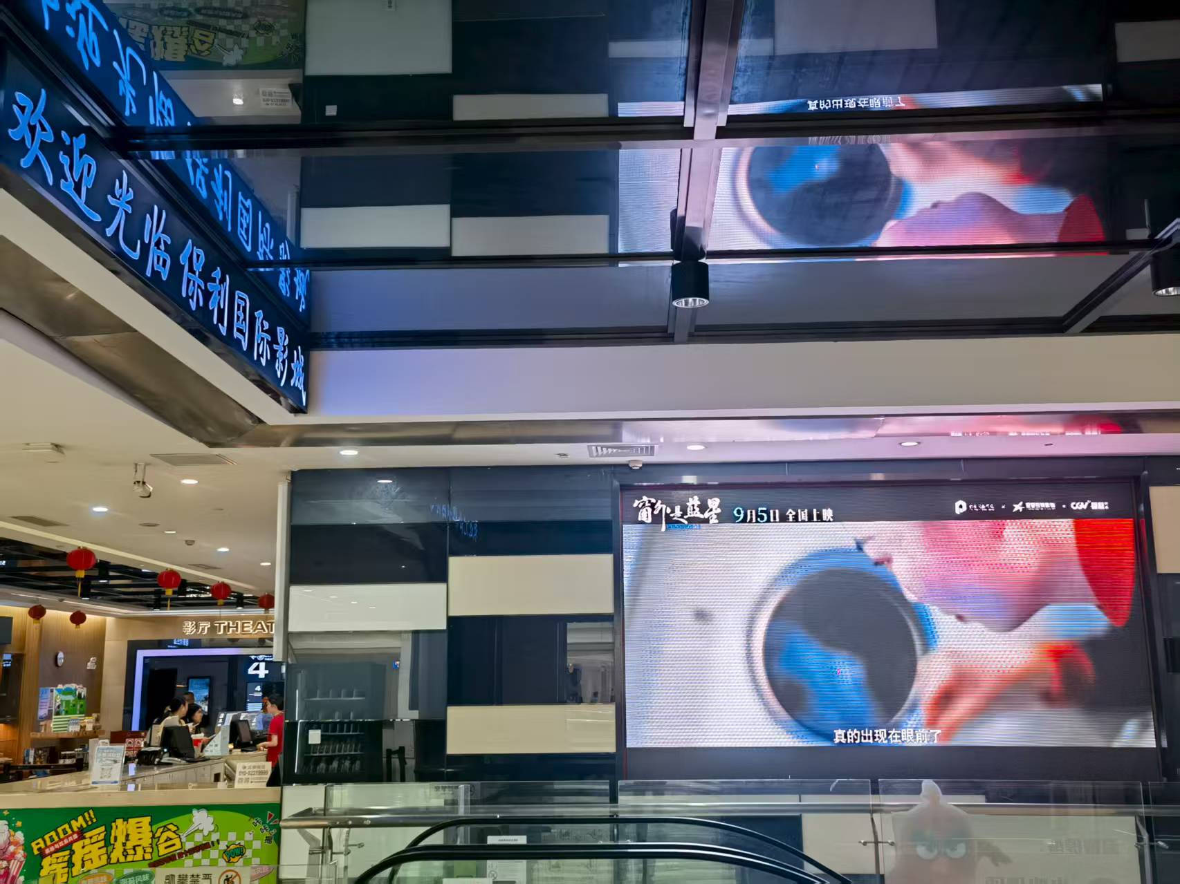 在河源,万隆城和坚基购物中心播放影片预告,电子屏温柔提示来往的人:别忘了,抬头看看蓝星。