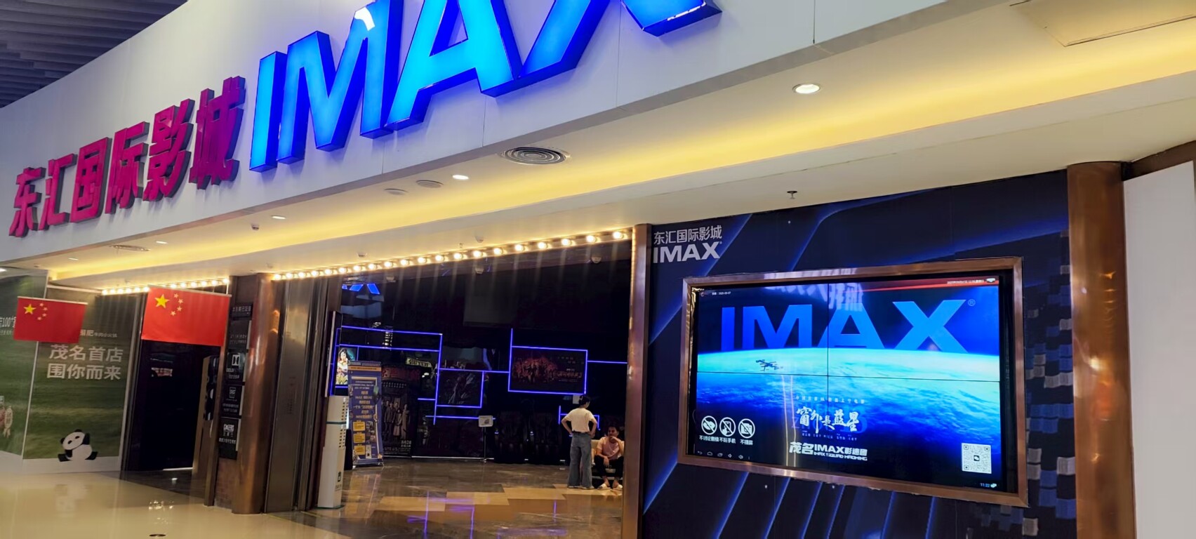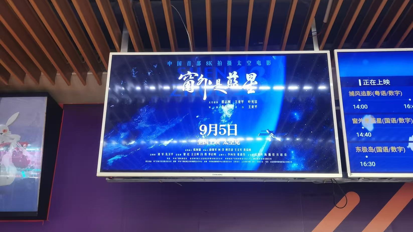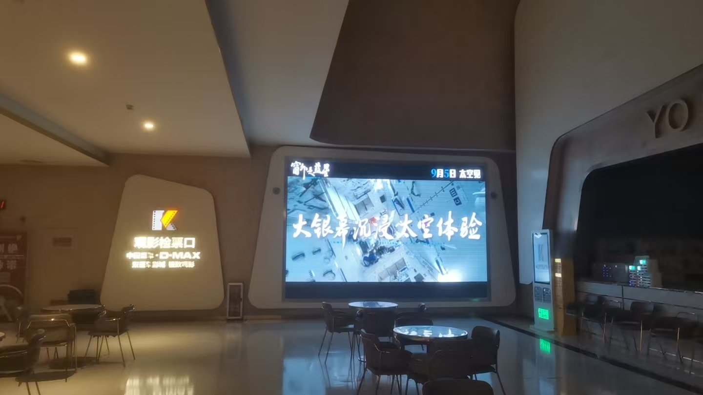 在梅州,横店电影城前的大屏上循环播放《窗外是蓝星》预告片,邀约观众开启“太空之旅”。