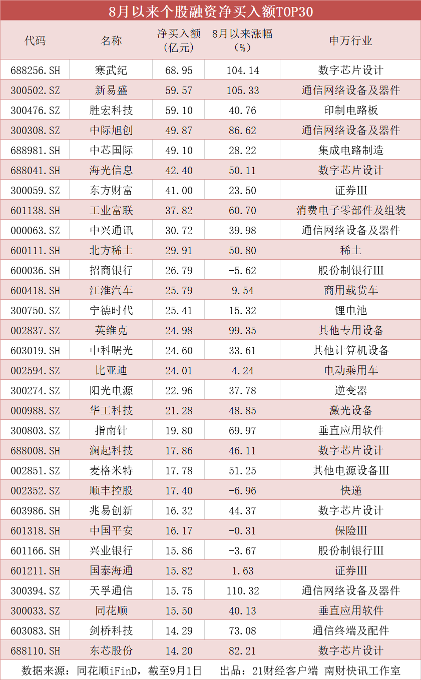 8月以来,两融余额连续多个交易日增长,期间9只个股获融资净买入超30亿元,寒武纪(688256.SH)、新易盛(300502.SZ)、胜宏科技(300476.SZ)位居前三,分别获融资净买入68.95亿元、59.57亿元、59.1亿元,寒武纪、新易盛、天孚通信(300394.SZ)8月以来股价翻倍。