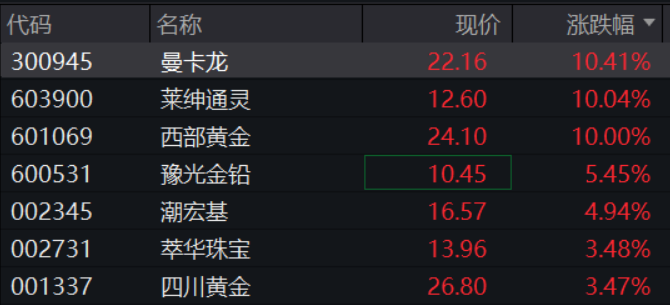 A股市场上,黄金珠宝板块持续活跃,莱绅通灵、西部黄金等多只个股涨停。