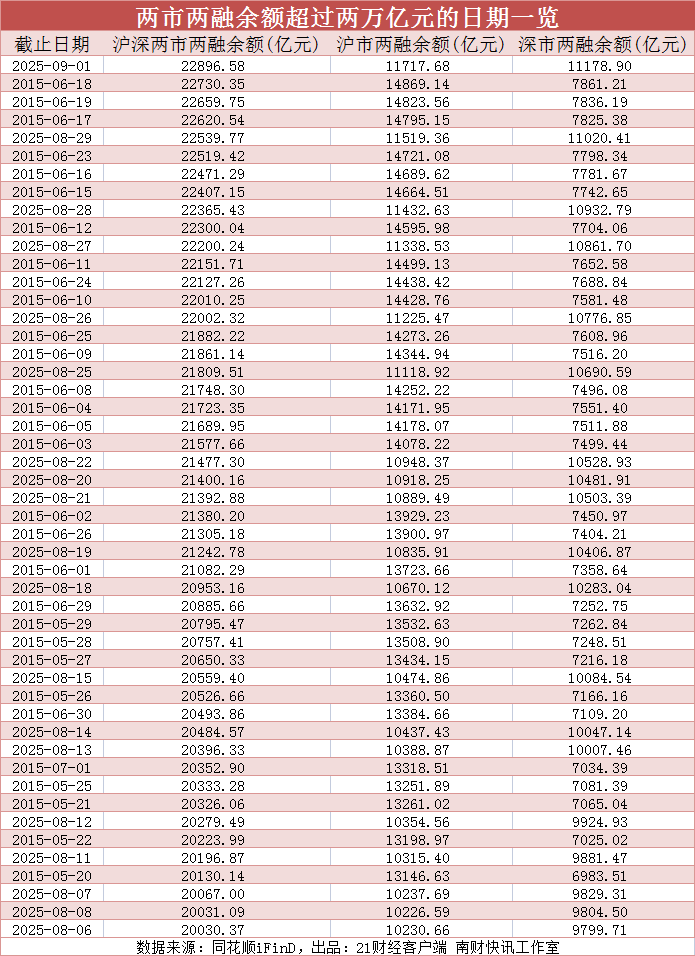 据21财经·南财快讯记者统计,截至9月1日,两市两融余额攀升至2.29万亿元,刷新2015年6月18日创下的2.27万亿元历史峰值,较上一日激增356.81亿元,其中融资余额同步突破2.27万亿元大关,亦超过2015年6月18日的历史峰值。