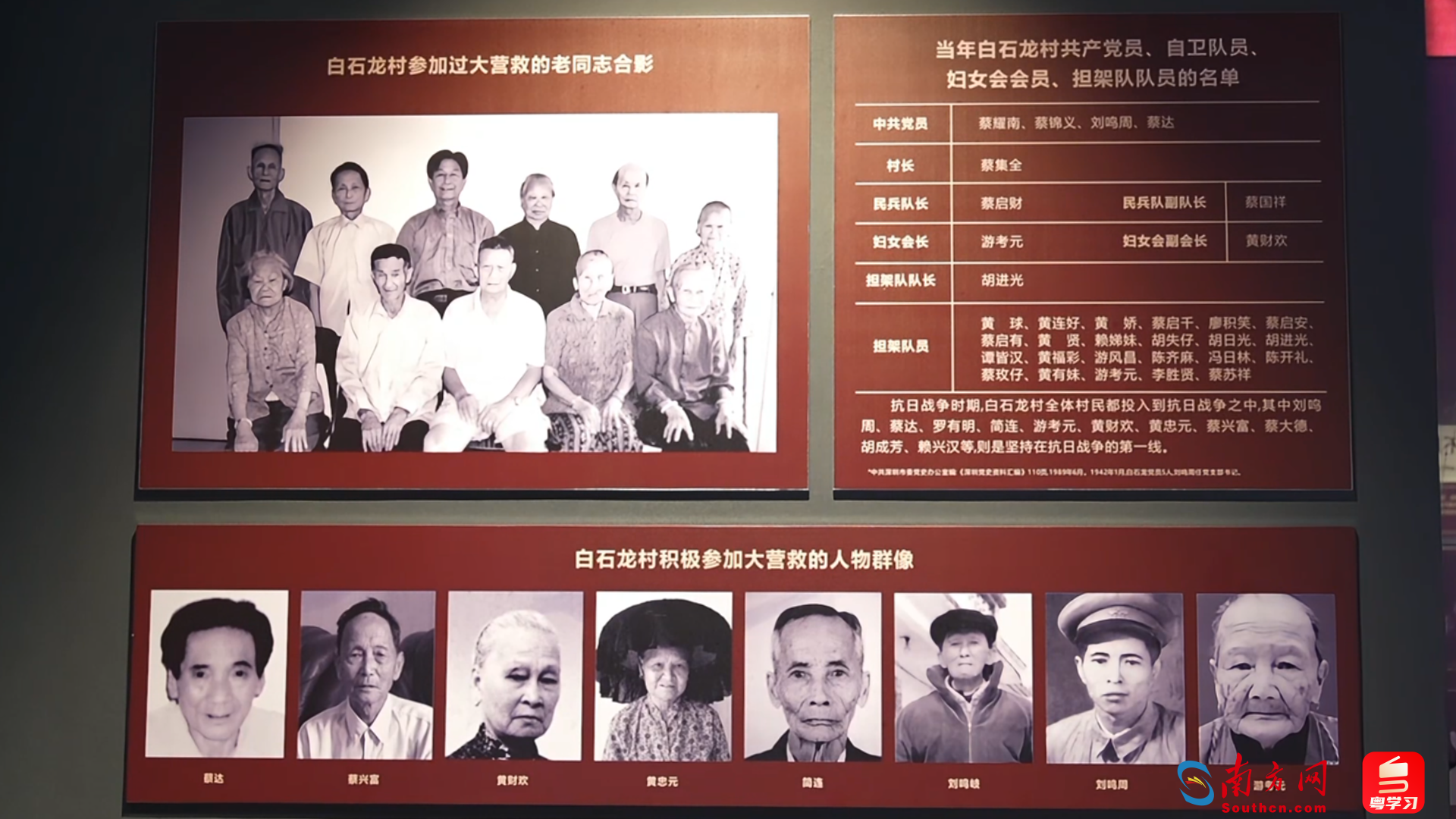 深圳市民治白石龙股份合作公司总经理杨建辉介绍,当地村民积极投身抗战,男女老少踊跃参加自卫队、农会、妇女会和担架队。杨建辉的叔公刘鸣周时任地下党支书,外婆黄忠元则与三四个妇女一起负责挑担买米和做饭送饭。