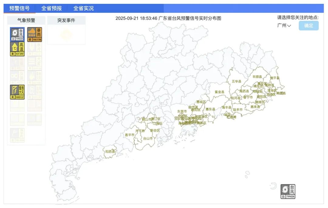 截至9月21日18时53分,广东台风预警信号发布情况广东气象网截图