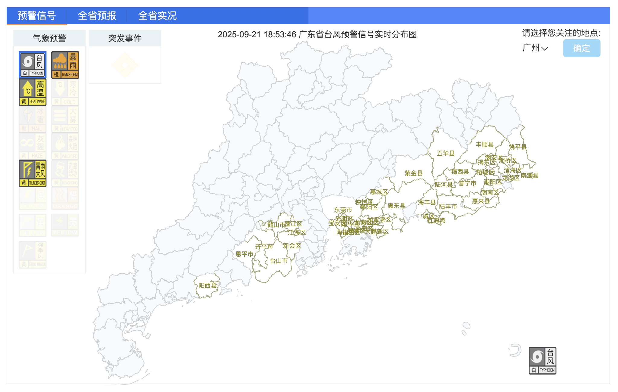 随着“桦加沙”进一步移近,广东多地自9月21日午后,陆续发布台风预警信号。截至9月21日18时53分,潮州、梅州、汕头、揭阳、汕尾、河源、惠州、东莞、深圳、江门、阳江等地,已有市县区发布台风白色预警信号。