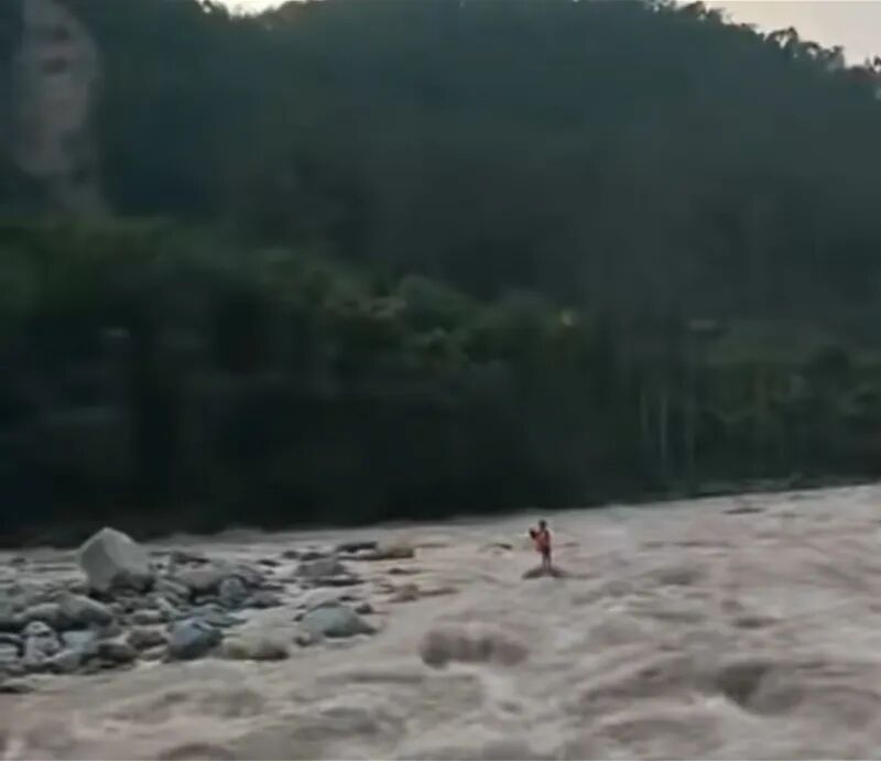 男孩被困河水中央。