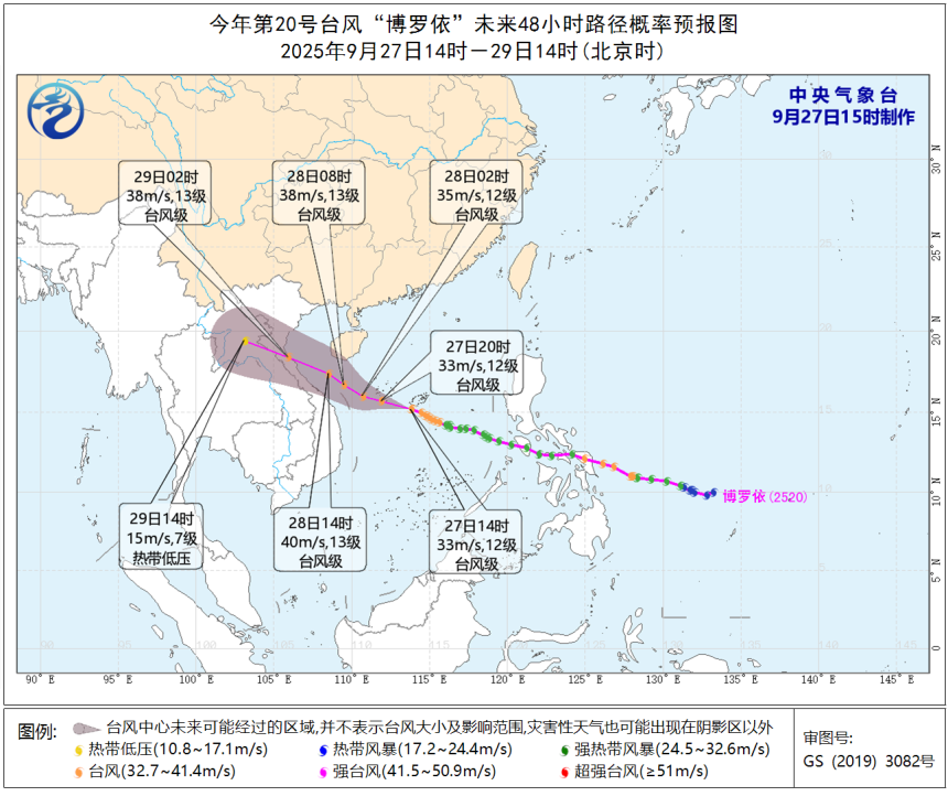 根据中央气象台观测,今年第20号台风“博罗依”,9月27日16时中心距离海南省三沙市(西沙永兴岛)南偏东方向约180公里。预计“博罗依”将以每小时20-25公里的速度向西偏北方向移动,逐渐向海南岛以南海面靠近,并将于28日白天掠过上述海面,之后将于28日傍晚到夜间在越南中北部沿海登陆,以后逐渐减弱。预计“博罗依”在海南岛以南海面的最大强度可达台风级(35-40米/秒,12-13级),但也不完全排除能达到强台风级的可能。