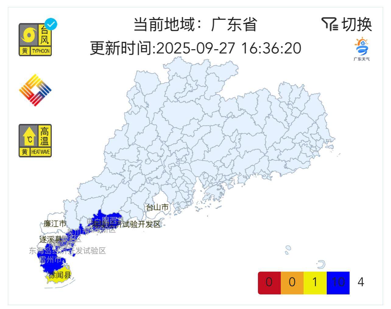 截至9月27日16时36分,广东暂只有徐闻一地发布台风“停课信号”,湛江其他区域发布台风蓝色至白色预警信号;茂名、阳江等地,有市县区发布台风蓝色预警信号;江门有市县区发布台风白色预警信号。