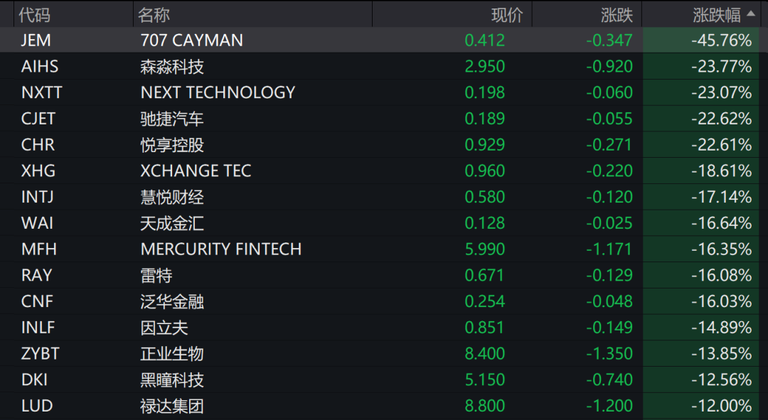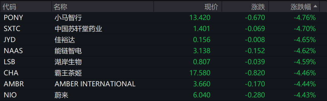 多只中概股跌幅超10%,蔚来、霸王茶姬跌超4%。