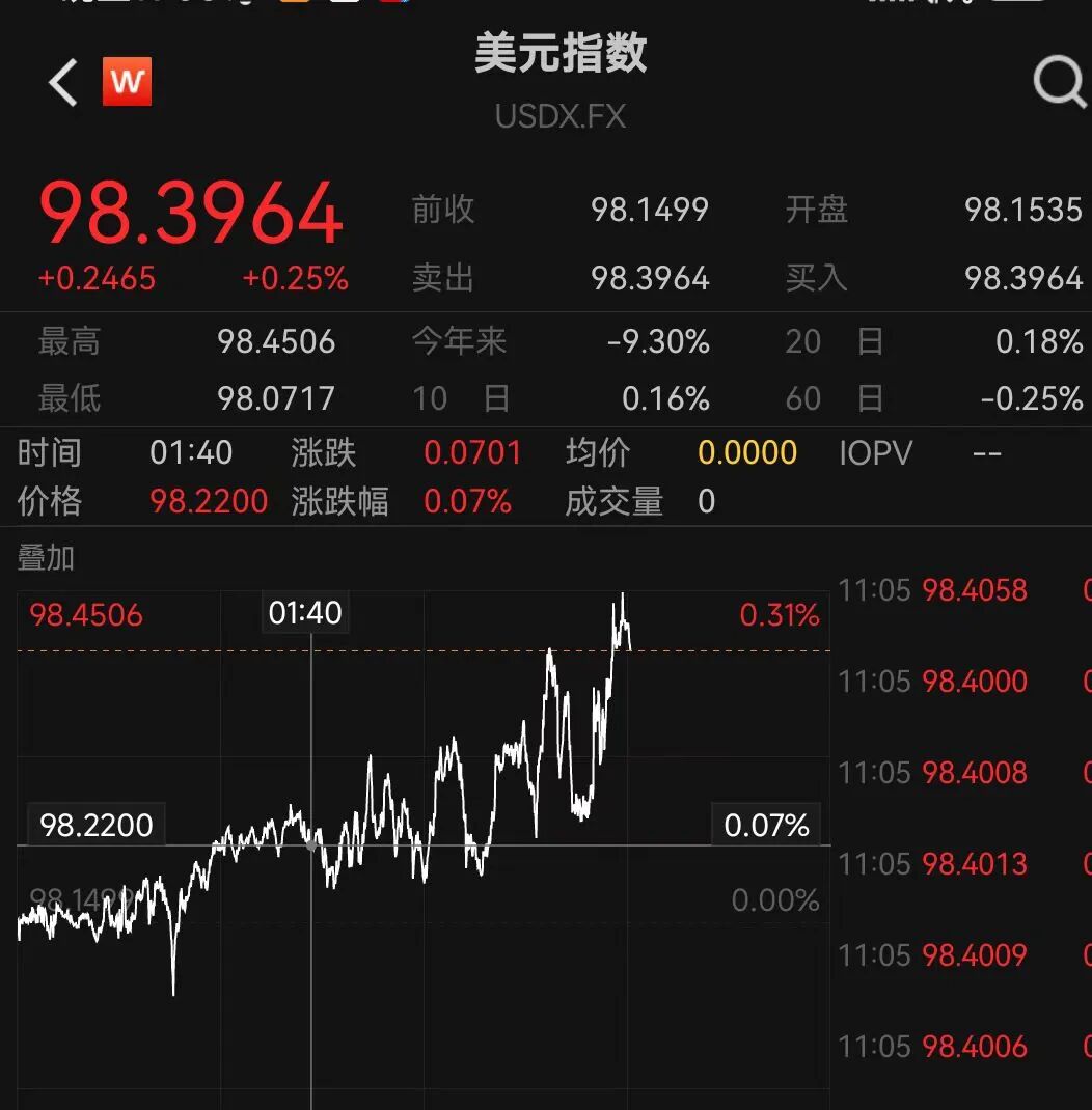 美元指数在失业申领数据公布后扩大涨幅,截至23:14,上涨0.25%至98.39。