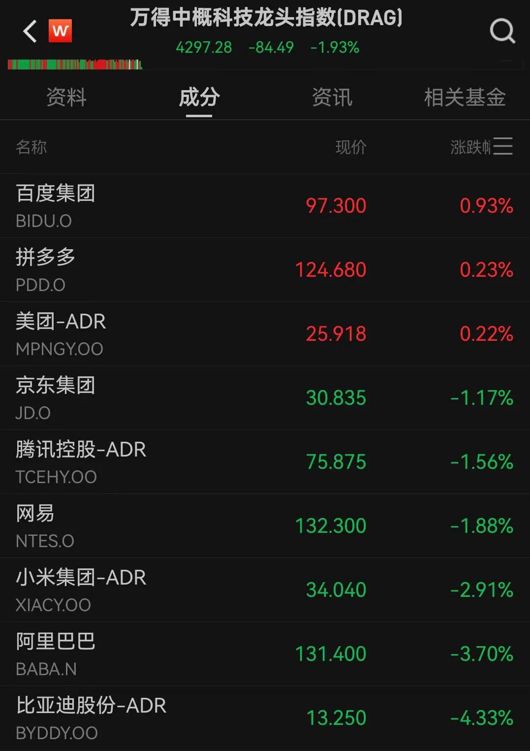 截至23:17,万得中概科技龙头指数跌1.93%,百度、拼多多、美团翻红,比亚迪股份-ADR、小米集团、网易等跌幅居前,阿里巴巴跌3.7%。