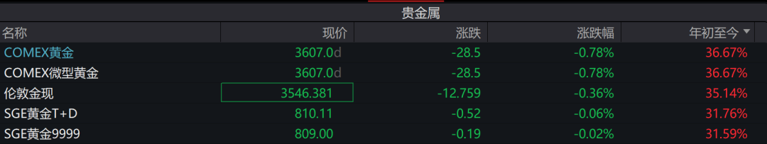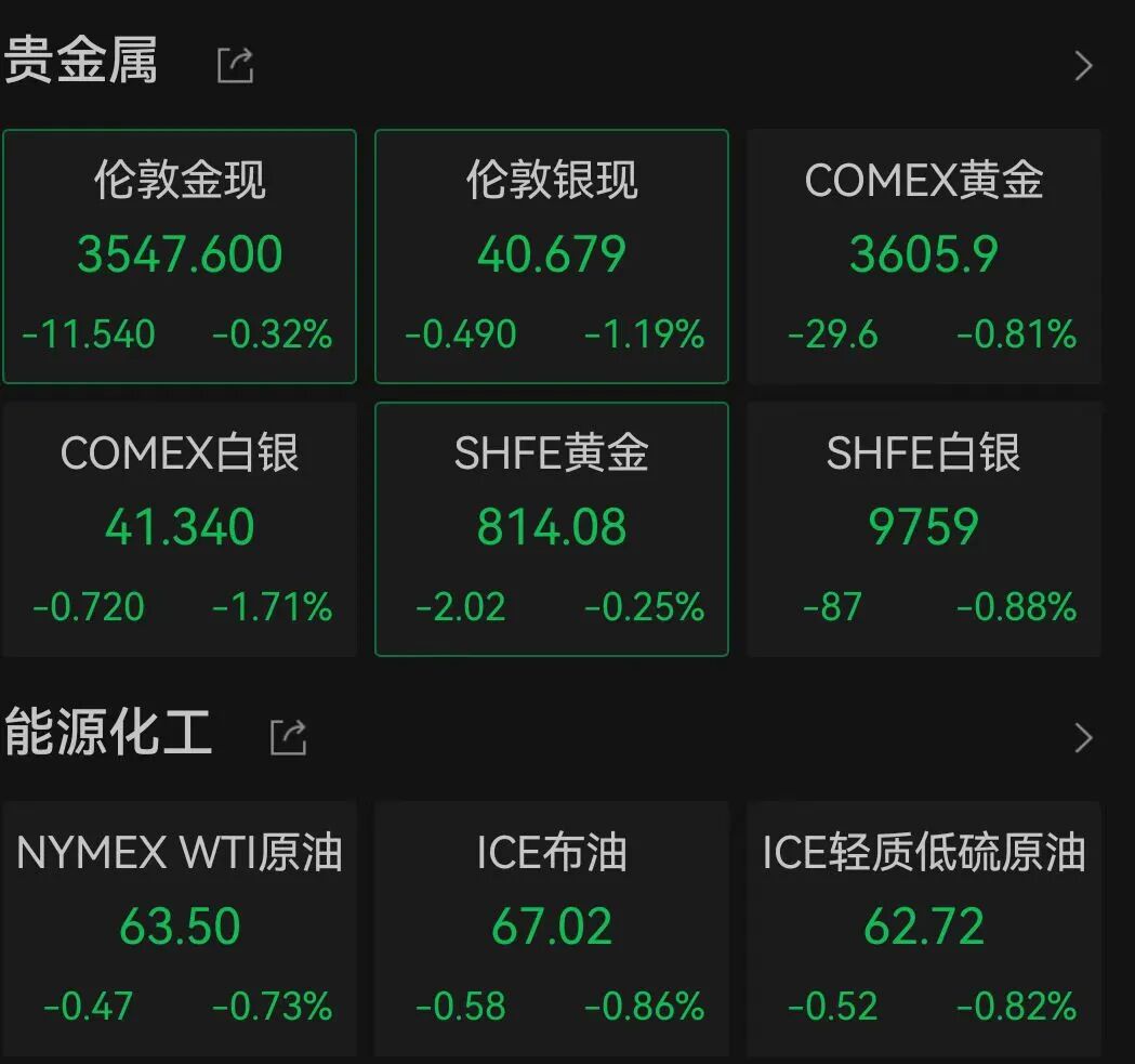 截至23:19,COMEX黄金期货价格下跌0.81%,但仍维持在每盎司3600美元关口上方;伦敦金现货价格跌0.32%,报3547美元/盎司,跌破3550美元/盎司。NYMEX原油期货主力合约、ICE布油期货主力合约双双跌近1%。