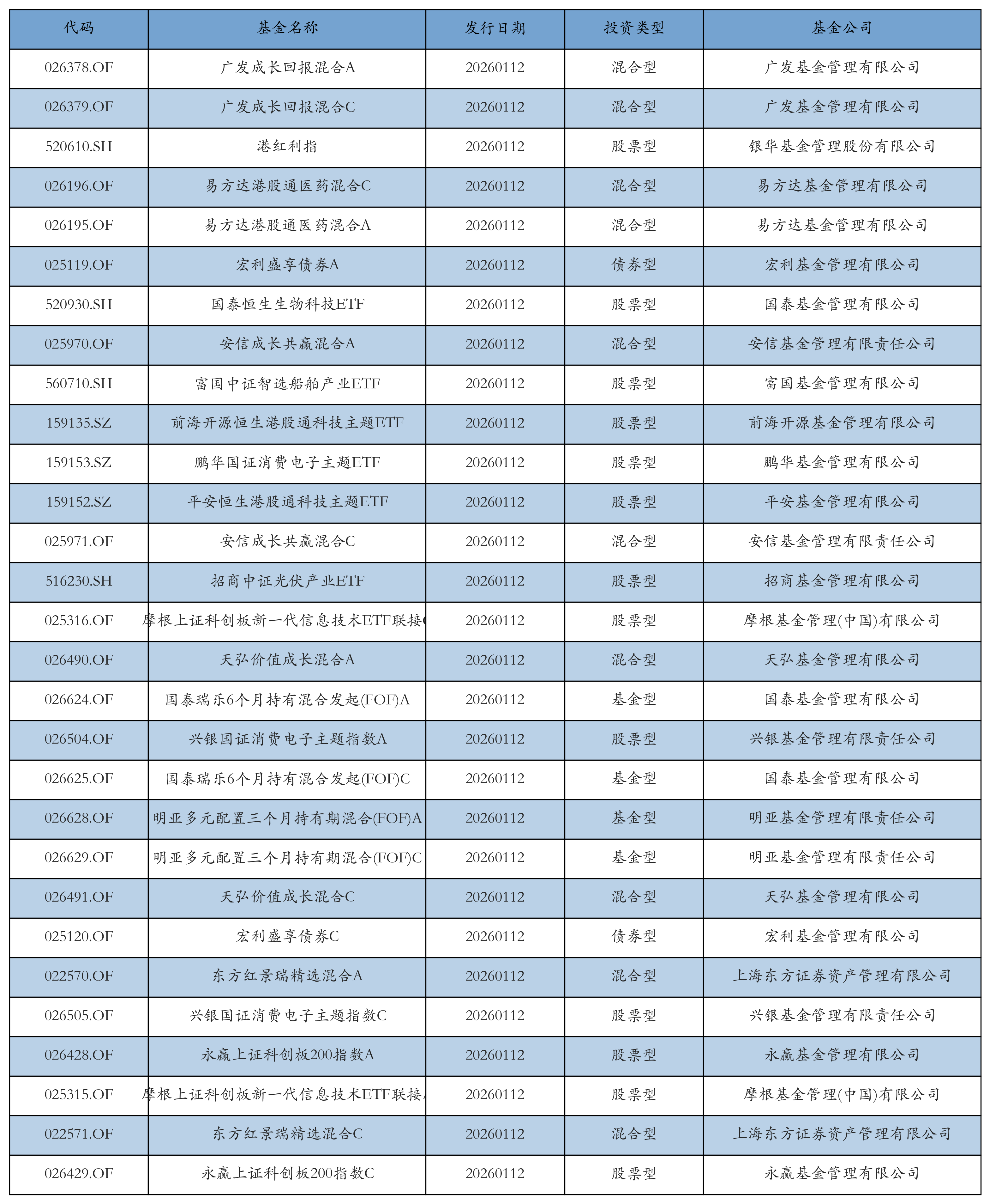 昨日有29只新基金发行,分别为:广发成长回报混合A、广发成长回报混合C、港红利指、易方达港股通医药混合C、易方达港股通医药混合A、宏利盛享债券A、国泰恒生生物科技ETF、安信成长共赢混合A、富国中证智选船舶产业ETF、前海开源恒生港股通科技主题ETF、鹏华国证消费电子主题ETF、平安恒生港股通科技主题ETF、安信成长共赢混合C、招商中证光伏产业ETF、摩根上证科创板新一代信息技术ETF联接C、天弘价值成长混合A、国泰瑞乐6个月持有混合发起(FOF)A、兴银国证消费电子主题指数A、国泰瑞乐6个月持有混合发起(FOF)C、明亚多元配置三个月持有期混合(FOF)A、明亚多元配置三个月持有期混合(FOF)C、天弘价值成长混合C、宏利盛享债券C、东方红景瑞精选混合A、兴银国证消费电子主题指数C、永赢上证科创板200指数A、摩根上证科创板新一代信息技术ETF联接A、东方红景瑞精选混合C、永赢上证科创板200指数C,详情见下表: