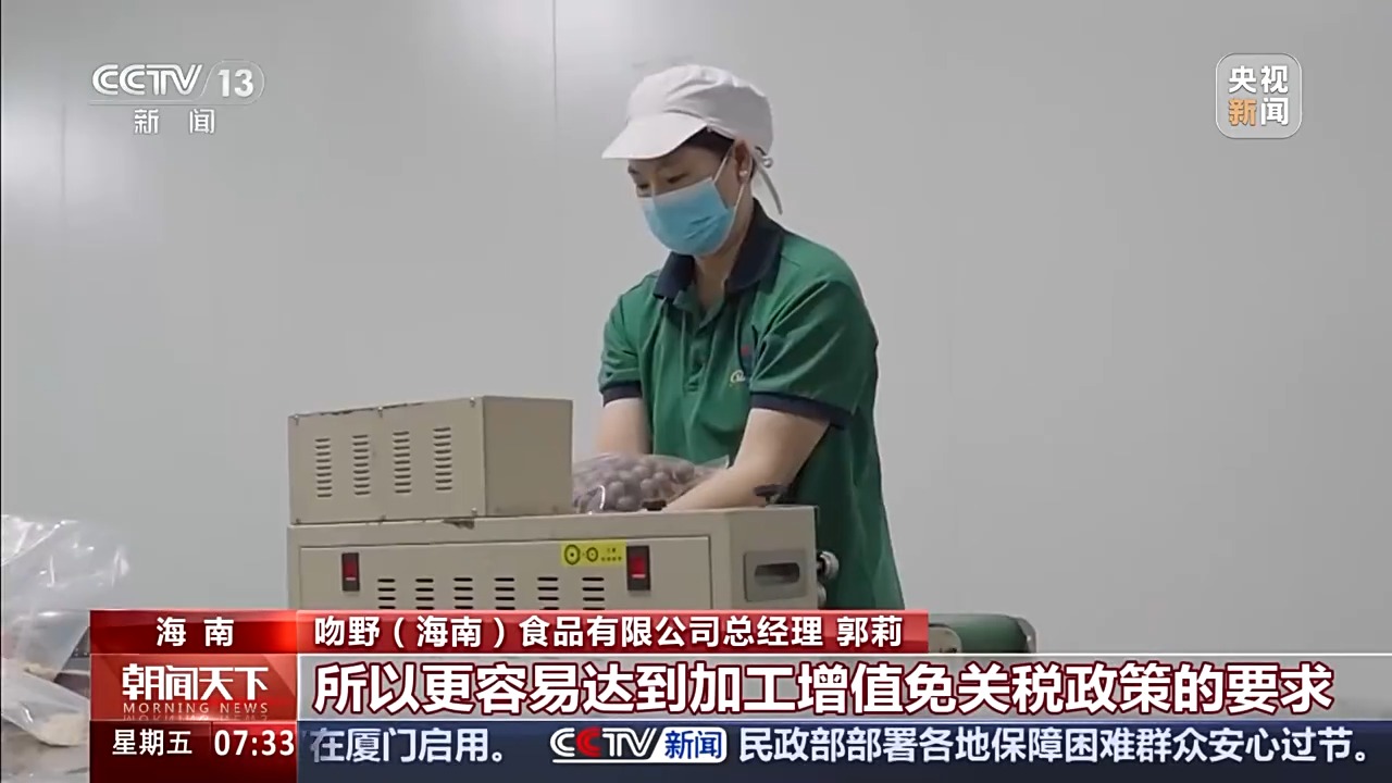 吻野(海南)食品有限公司总经理 郭莉:比如夏威夷果,原来我们必须要卖到143元/斤才能享受免税。封关之后,使用岛内的盐,我们只需要卖130元/斤以上,所以更容易达到加工增值免关税政策的要求。