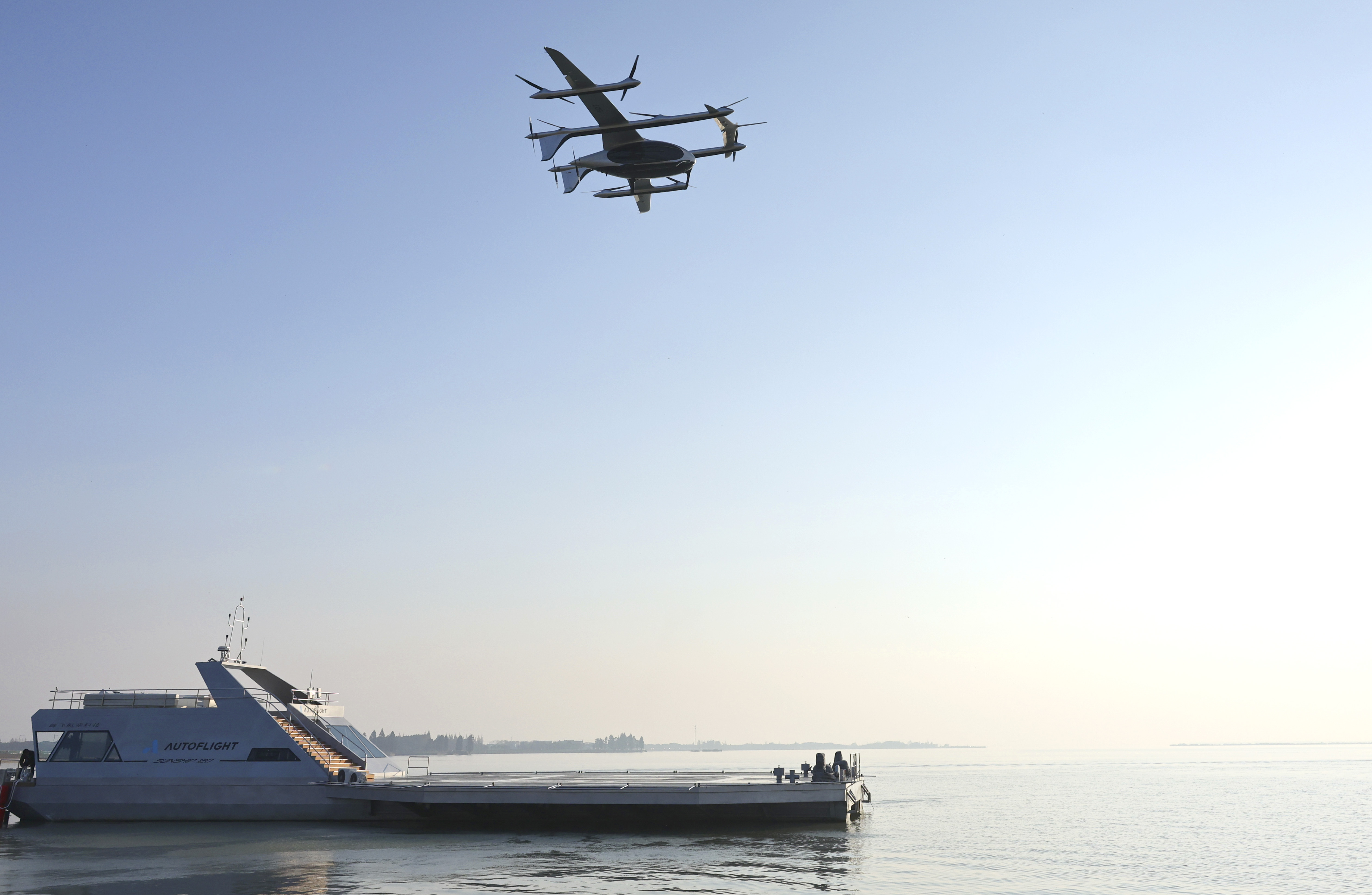 2025年11月22日,在江苏昆山的峰飞航空全球科技日活动中,一架电动垂直起降飞行器从“水上机场”起飞。新华社记者方喆摄