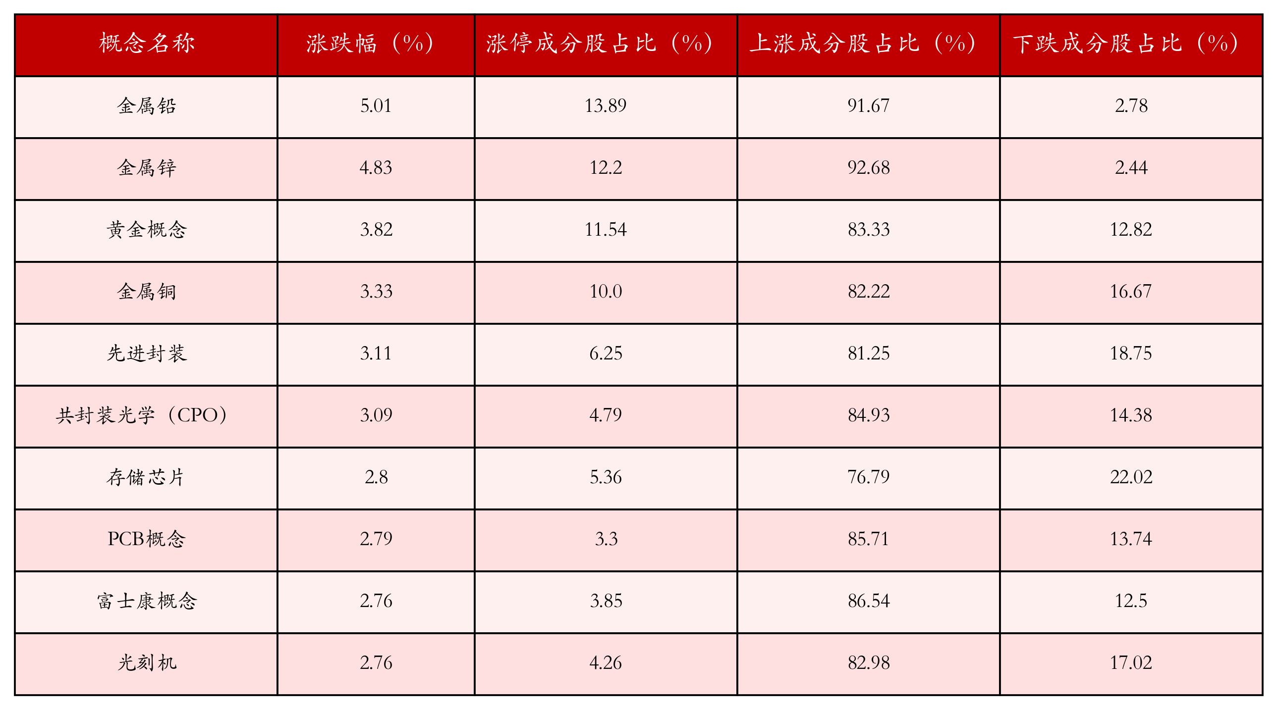 根据A股概念涨跌幅与所对应的股票池综合分析,涨幅靠前的三个概念板块分别为:金属铅、金属锌与黄金概念。排名前10位的概念板块相关数据见下表: