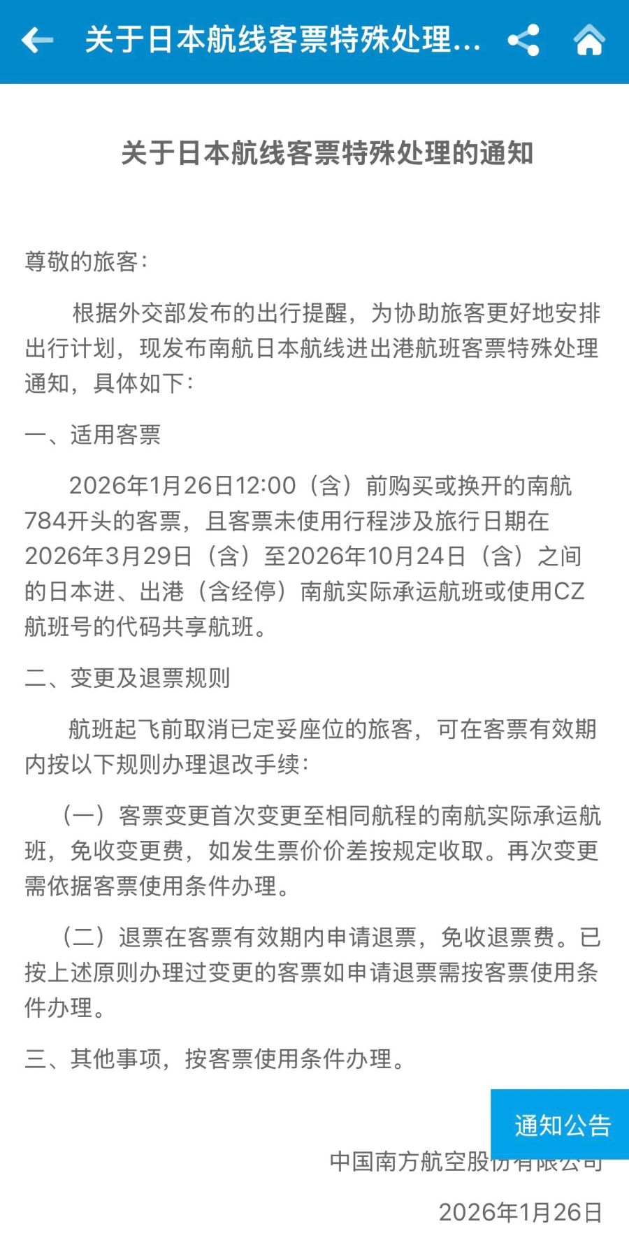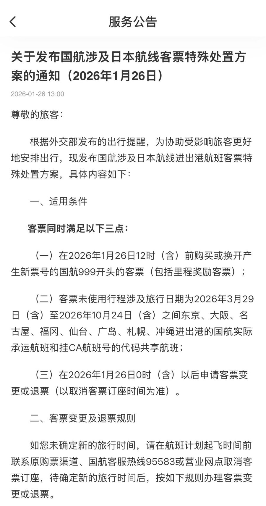 1月26日下午,国航、东航、南航集体发布公告:1月26日前出票,航班起飞日期在2026年3月29日(含)至2026年10月24日(含),涉及日本进港、出港或经停航班可免费退改。三大航带了头,预计其他中国航司都会跟进该政策。