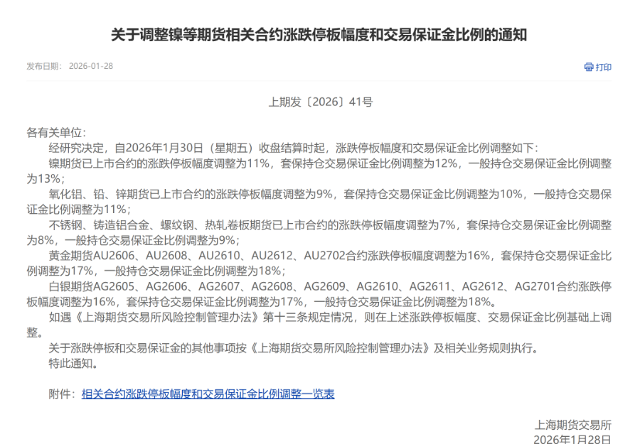 1月28日晚间,上海期货交易所发布通知,自2026年1月30日(星期五)收盘结算时起,涨跌停板幅度和交易保证金比例调整如下:金期货AU2606、AU2608、AU2610、AU2612、AU2702合约涨跌停板幅度调整为16%,套保持仓交易保证金比例调整为17%,一般持仓交易保证金比例调整为18%;白银期货AG2605、AG2606、AG2607、AG2608、AG2609、AG2610、AG2611、AG2612、AG2701合约涨跌停板幅度调整为16%,套保持仓交易保证金比例调整为17%,一般持仓交易保证金比例调整为18%。