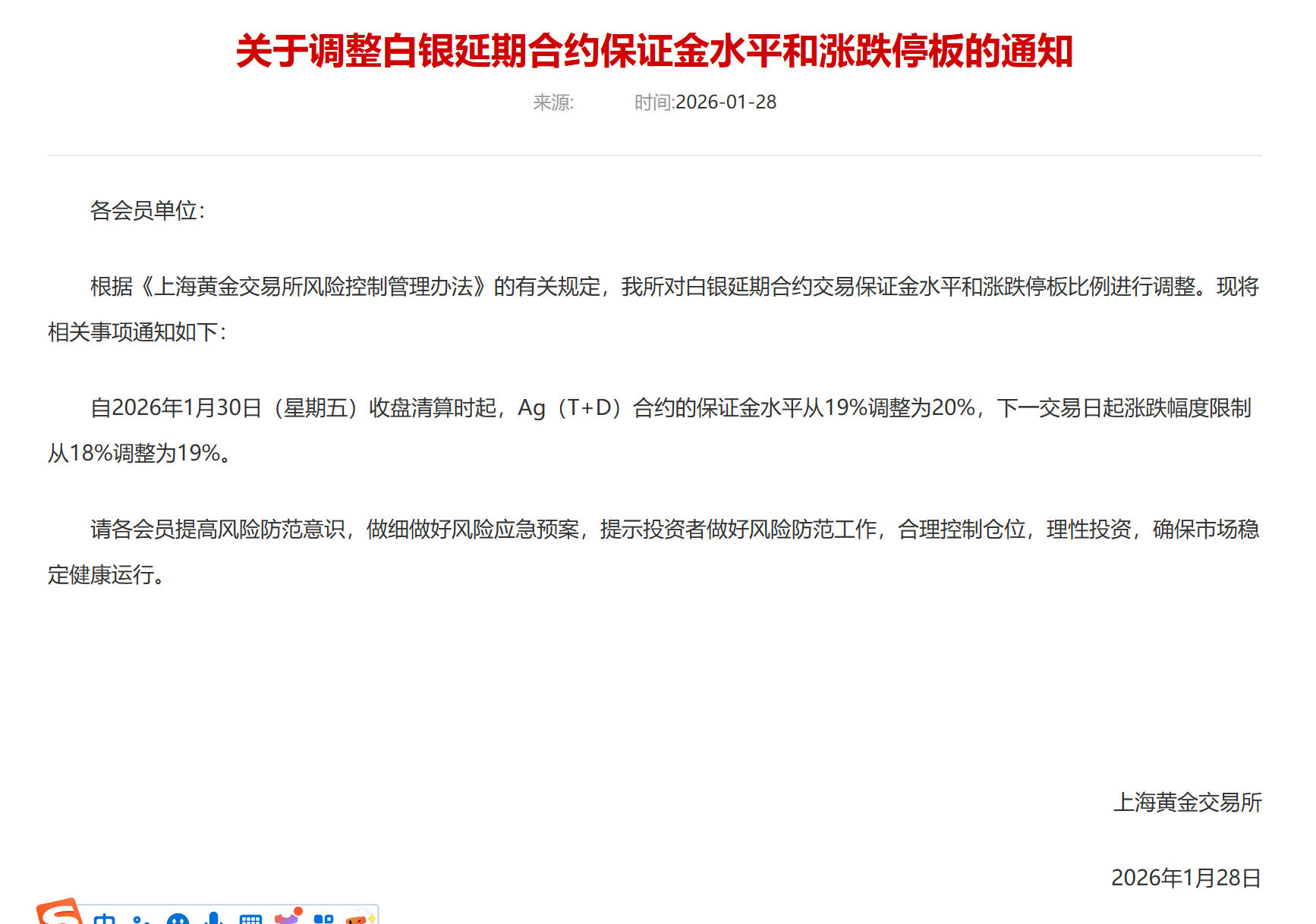 现将相关事项通知如下:自2026年1月30日(星期五)收盘清算时起,Ag(T+D)合约的保证金水平从19%调整为20%,下一交易日起涨跌幅度限制从18%调整为19%。
