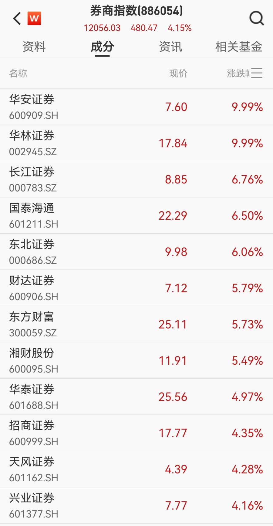 行情火热下,“牛市旗手”券商板块强势上涨。截至1月6日收盘,华安证券、华林证券等个股涨停,长江证券、国泰海通、东北证券、财达证券等多股涨超5%。互联网券商亦表现亮眼,大智慧涨停,同花顺涨超12%,指南针涨超9%,东方财富涨超5%。