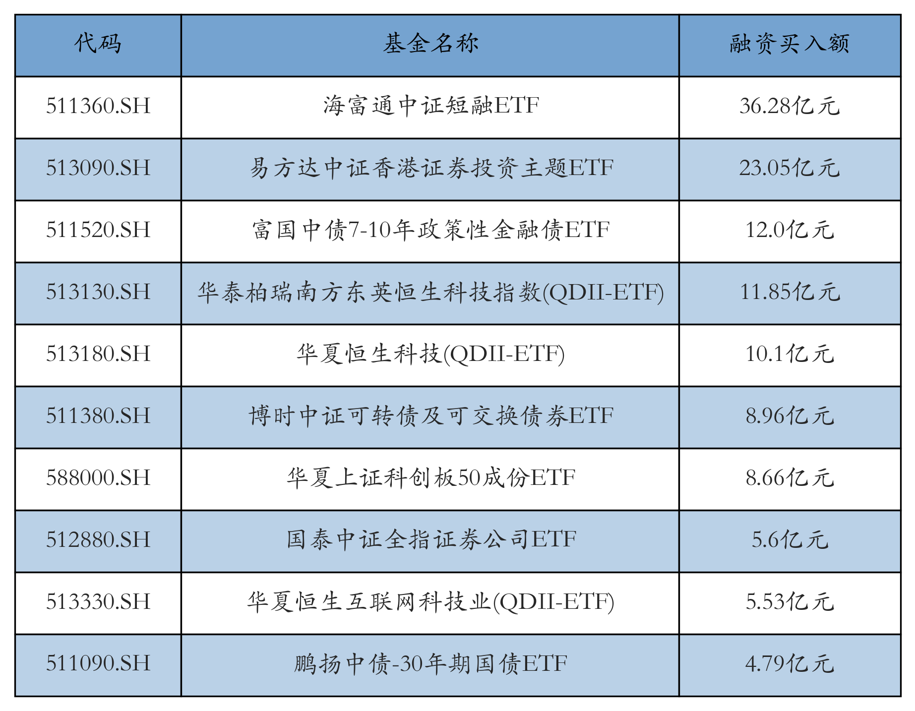 1月6日ETF融资买入额前三位分别为:海富通中证短融ETF(36.28亿元)、易方达中证香港证券投资主题ETF(23.05亿元)和富国中债7-10年政策性金融债ETF(12.0亿元),前10具体见下表: