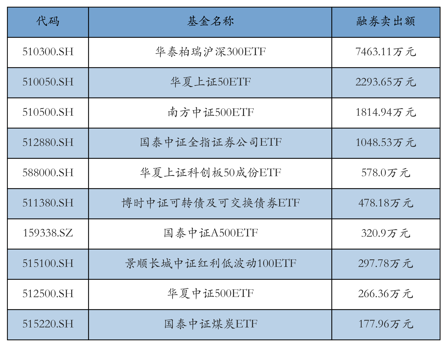 1月6日ETF融券卖出额前三位分别为:华泰柏瑞沪深300ETF(7463.11万元)、华夏上证50ETF(2293.65万元)和南方中证500ETF(1814.94万元),前10具体见下表: