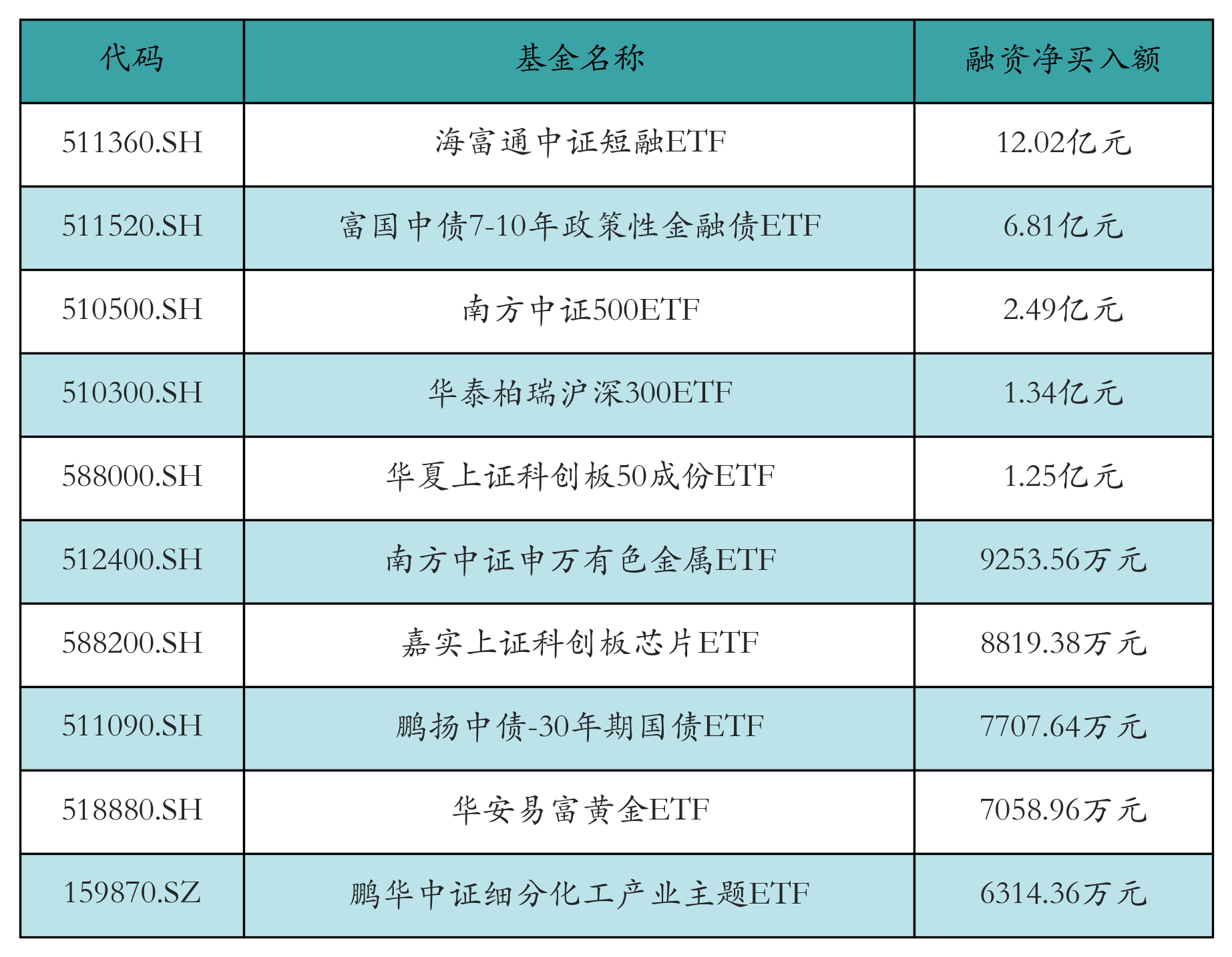 1月6日ETF融资净买入额前三位分别为:海富通中证短融ETF(12.02亿元)、富国中债7-10年政策性金融债ETF(6.81亿元)和南方中证500ETF(2.49亿元),前10具体见下表: