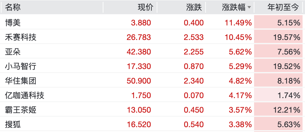 热门中概股涨跌不一,纳斯达克中国金龙指数跌0.78%。博美、禾赛科技涨超10%,小马智行、亚朵涨超5%;阿特斯太阳能、BOSS直聘、老虎证券跌超5%,阿里巴巴跌超3%。