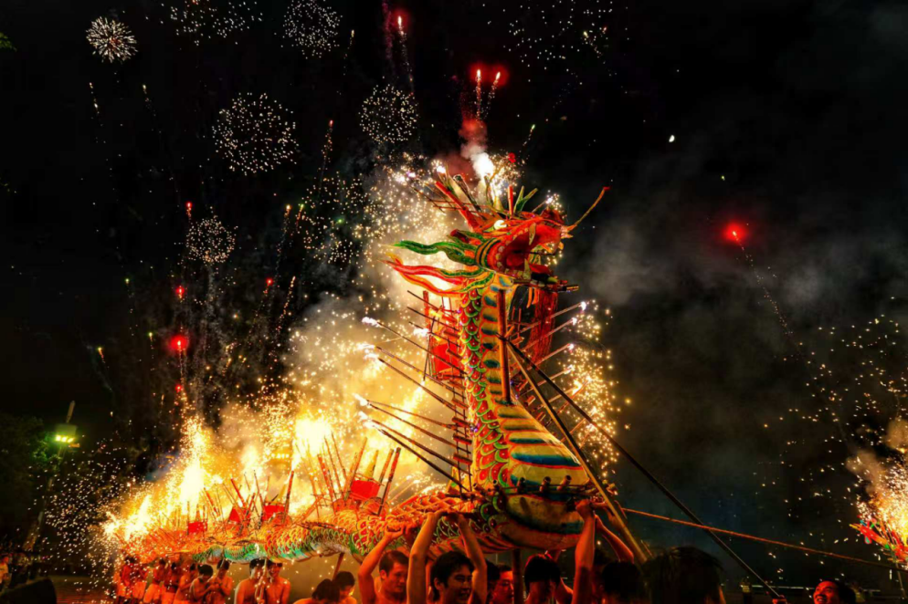当夜幕降临,灼热的星雨便点亮了梅江两岸。国家级非遗埔寨火龙惊艳亮相,表演者赤膊上阵,高擎龙头,舞动龙身,摇摆龙尾,鱼虾穿梭其间,烟花怒放、火箭四射,在热闹欢腾中祈愿祥和吉利、岁岁平安,成就一场视觉、听觉与心灵的三重震撼。