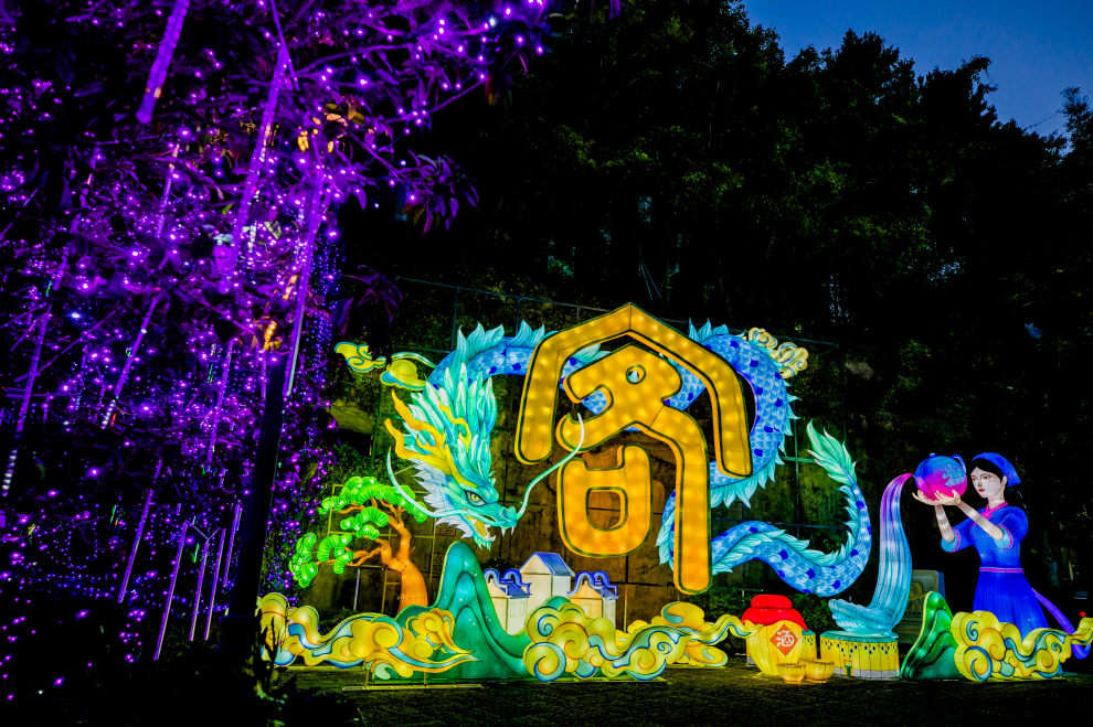 各式各样的灯组琳琅满目:“喜迎新春”“鲤鱼跃龙门”“梅州女神”“龙马精神”“锦鲤通道”,一场融合深厚客家文化与当代潮流体验的新春盛宴。