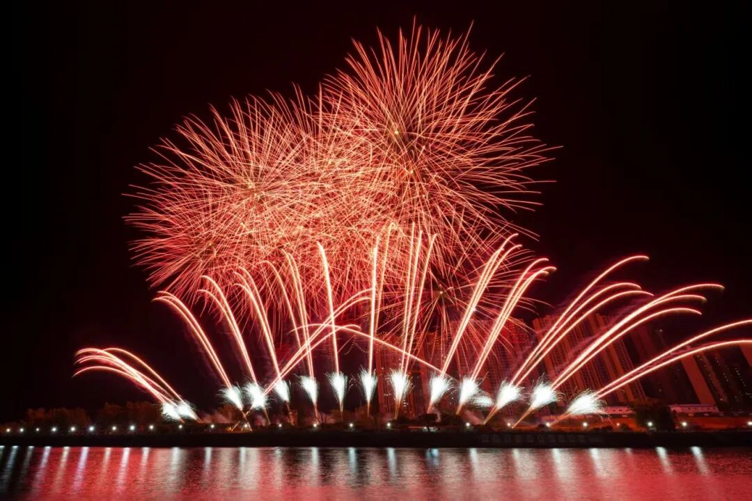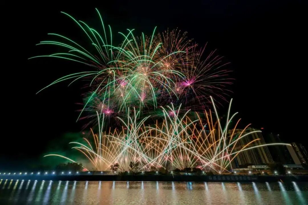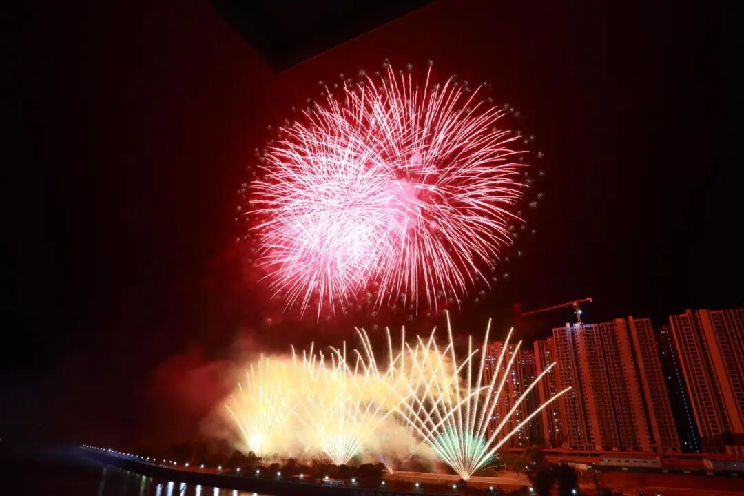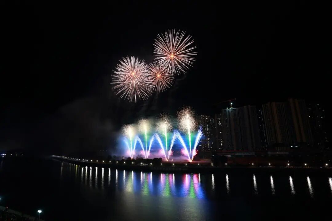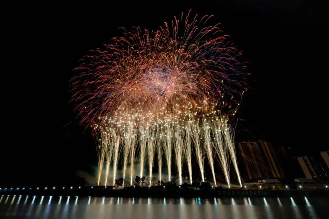 焰火表演以多重篇章铺陈夜空华彩,“盛宴迎宾”“心花怒放”“圆满佗城”“黄金满地”“万紫千红”等主题依次展开。“盛世红牡丹”绚烂绽放,红似丹霞映江,与武江碧道交相辉映;“十里桃花开”层层铺展,如春潮涌动,象征发展活力奔涌向前;“生命之树”光焰流转,寓意希望与幸福生生不息;紫色烟花漫天流淌,宛若星河坠地,承载着“圆满佗城、和谐共生”的美好寓意;“金闪瀑布”倾泻江面,映照出黄金柰李的丰收喜悦与城市高质量发展的耀眼光芒。还有10号、12号超高规格礼花弹腾空而起,锦冠、花束、钛雷齐放,将现场气氛推向高潮。观众纷纷举起手机定格美好瞬间,欢呼声在夜空中久久回荡。