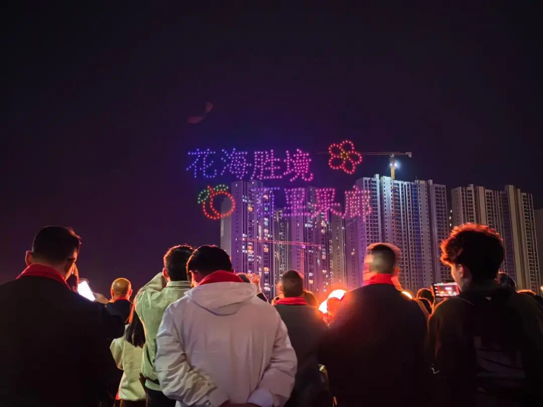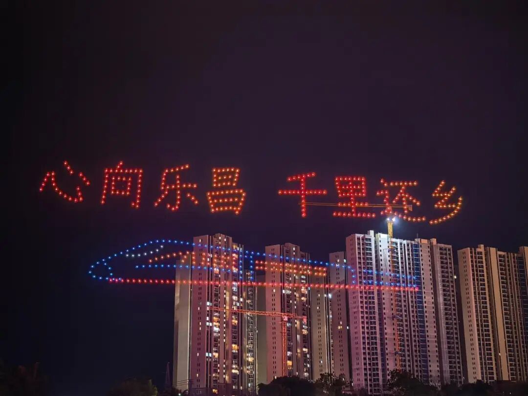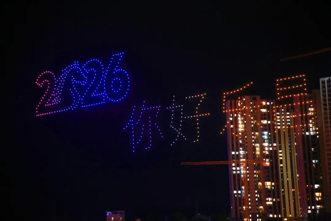 晚会伊始,夜幕如锦,星河作幕。数百架无人机翩然升空,光影编织出一幅别具匠心的新春长卷。“2026你好乐昌”“心向乐昌千里还乡”“新年快乐”等字样在夜空中次第呈现,仿佛写给新岁的深情问候,也承载着游子归乡的温暖情愫。
