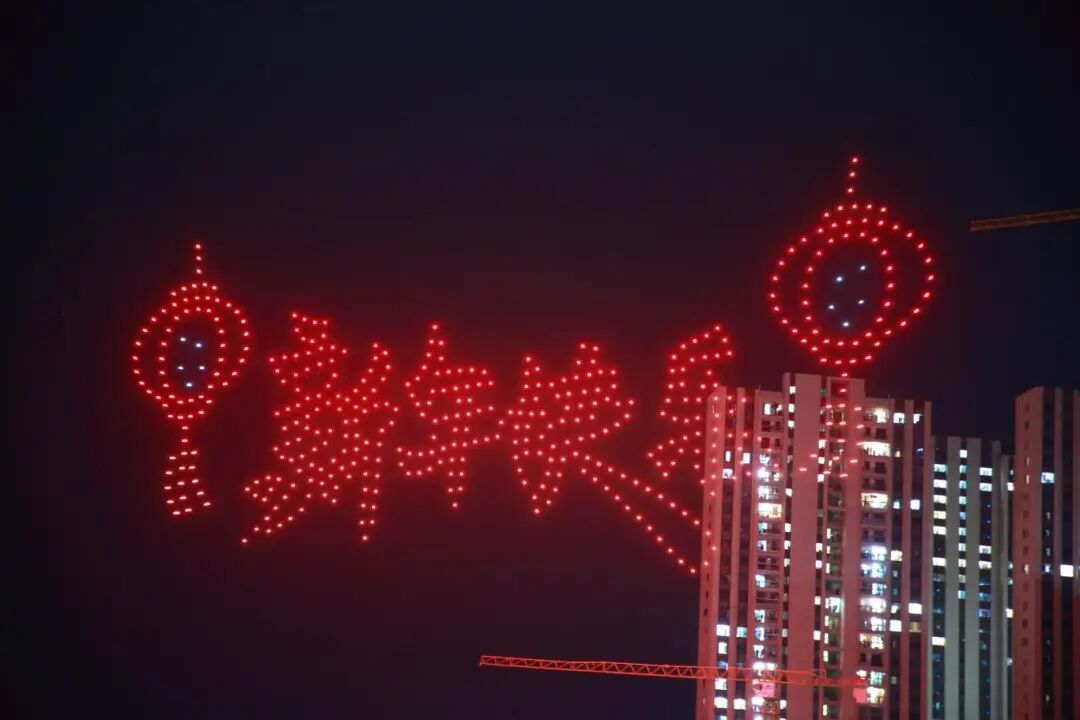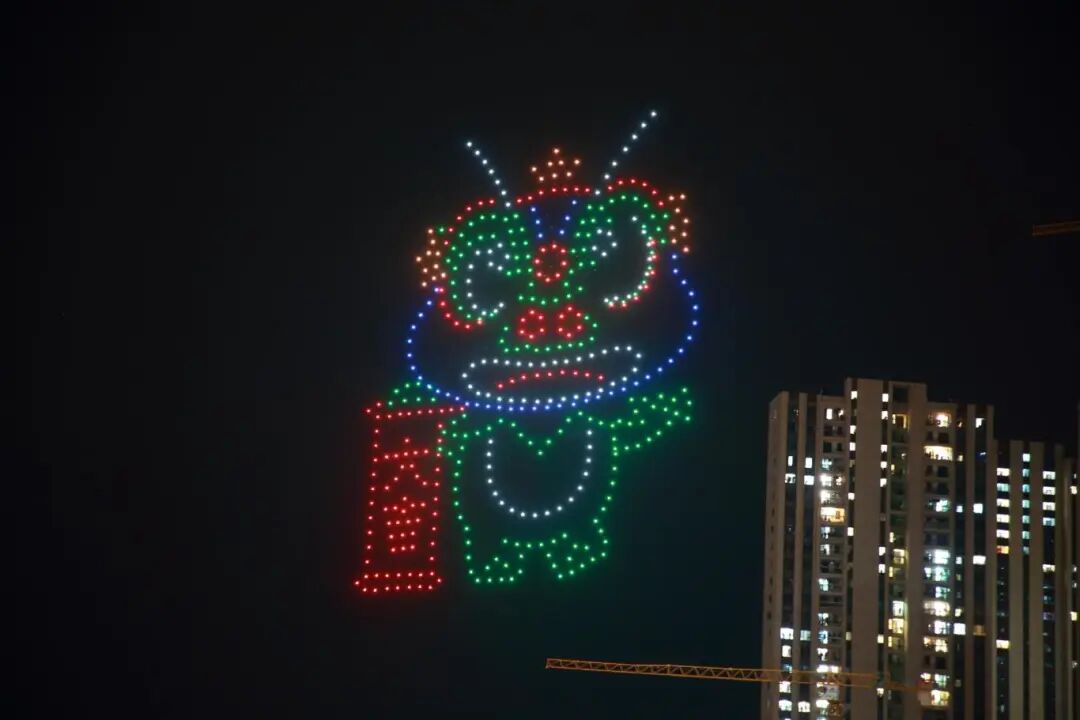 随后,手举祝福的乐昌青蛙狮灵动登场,姿态憨萌,似在夜空中欢腾起舞;桃花灼灼、黄金柰李晶莹闪耀,化作城市文化与特色产业的生动表达。其间,无人机还不断变换出更多寓意吉祥的图案与字样——“中国梦 强军梦”气势恢宏,财神形象喜庆祥瑞,鞭炮图案跃动夜空,引得现场观众惊叹连连、掌声不断。