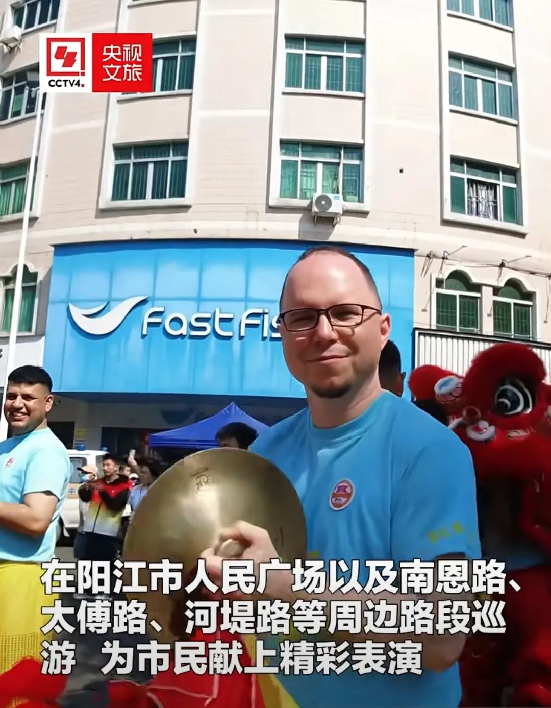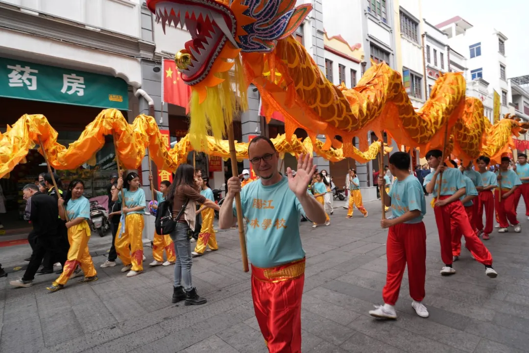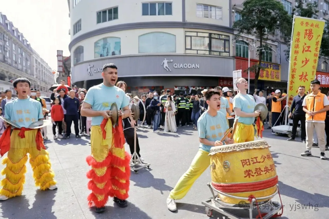 巡游队伍中,两位外国友人格外吸睛。来自巴基斯坦和波兰的小伙子身着传统服饰,手持锣鼓槌跟着节奏敲打,还不时与醒狮互动,一招一式有模有样。