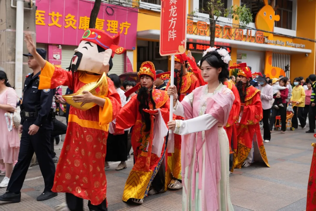 2月14日上午9时许,市区南恩路周边围观的市民已是里三层外三层。随着一阵激昂的锣鼓声,2026 年阳江春节民俗巡游展演正式启幕——9个表演方阵、2辆主题花车、360名表演人员组成的巡游队伍浩荡出发,舞龙翻腾、醒狮腾跃,瞬间点燃了整条老街的激情。