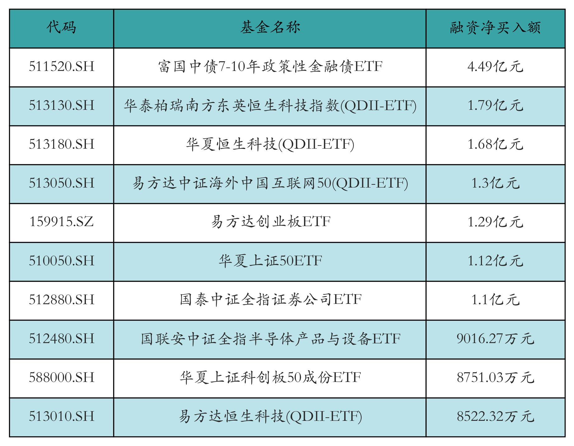 2月2日ETF融资净买入额前三位分别为:富国中债7-10年政策性金融债ETF(4.49亿元)、华泰柏瑞南方东英恒生科技指数(QDII-ETF)(1.79亿元)和华夏恒生科技(QDII-ETF)(1.68亿元),前10具体见下表:
