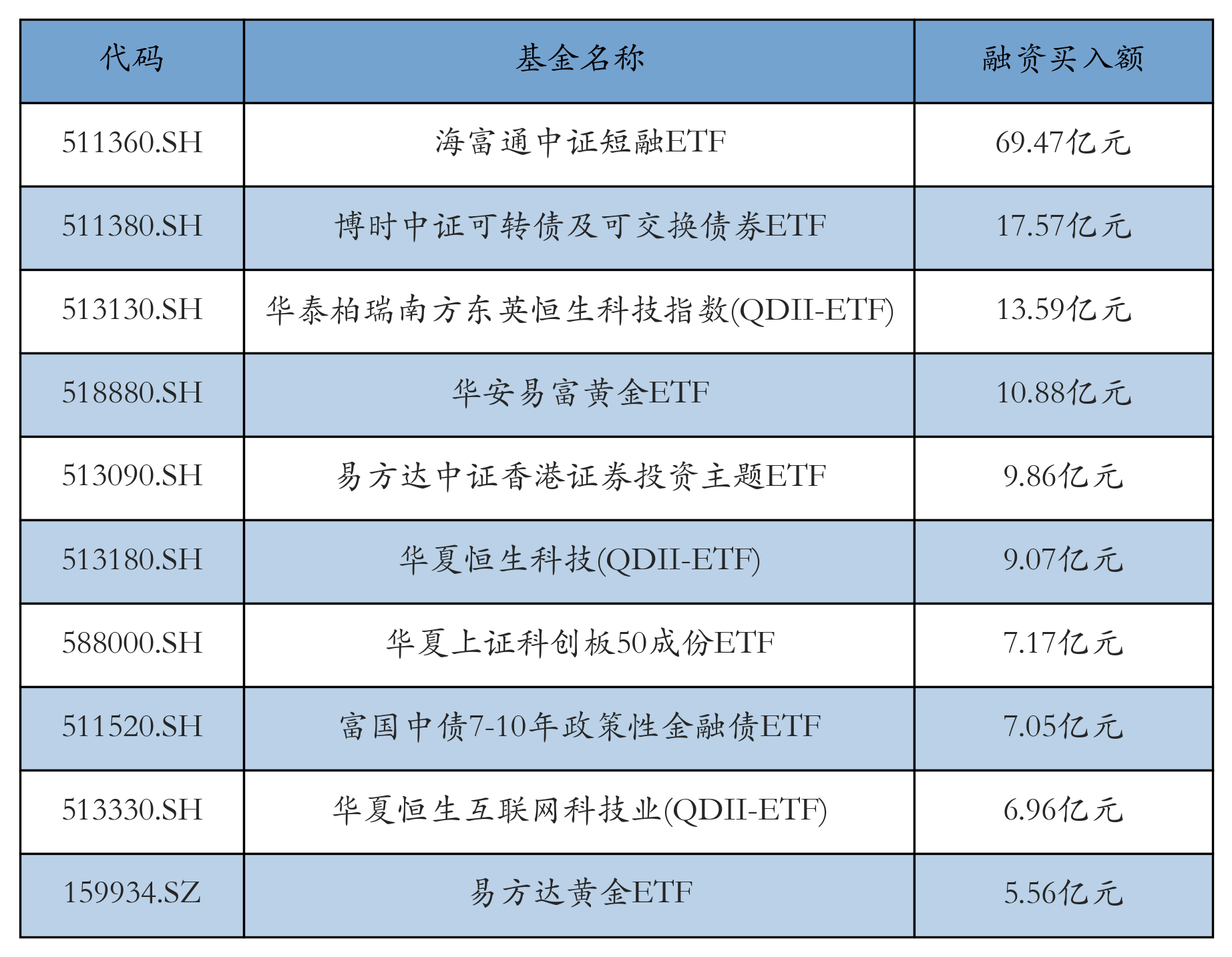2月2日ETF融资买入额前三位分别为:海富通中证短融ETF(69.47亿元)、博时中证可转债及可交换债券ETF(17.57亿元)和华泰柏瑞南方东英恒生科技指数(QDII-ETF)(13.59亿元),前10具体见下表: