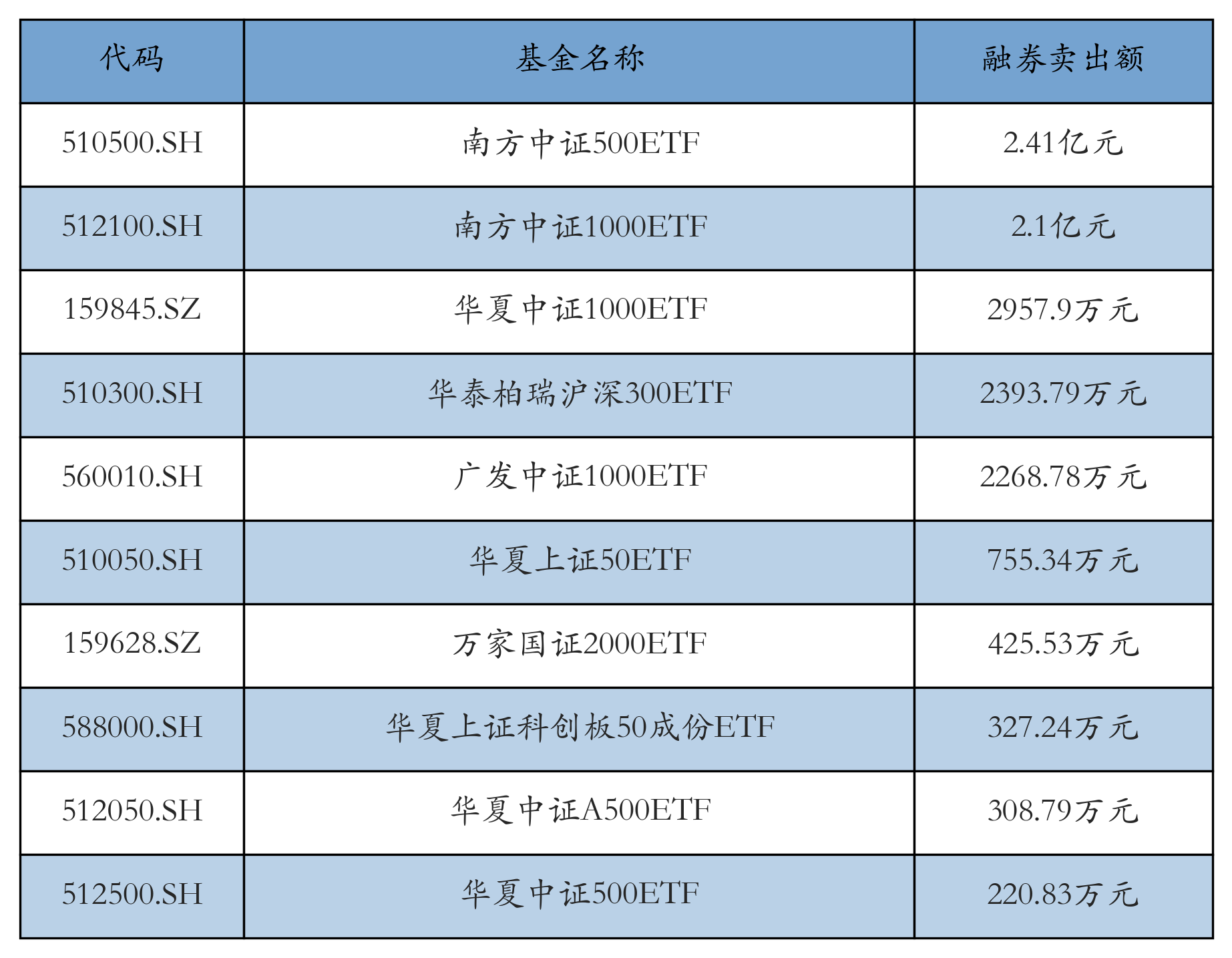2月2日ETF融券卖出额前三位分别为:南方中证500ETF(2.41亿元)、南方中证1000ETF(2.1亿元)和华夏中证1000ETF(2957.9万元),前10具体见下表: