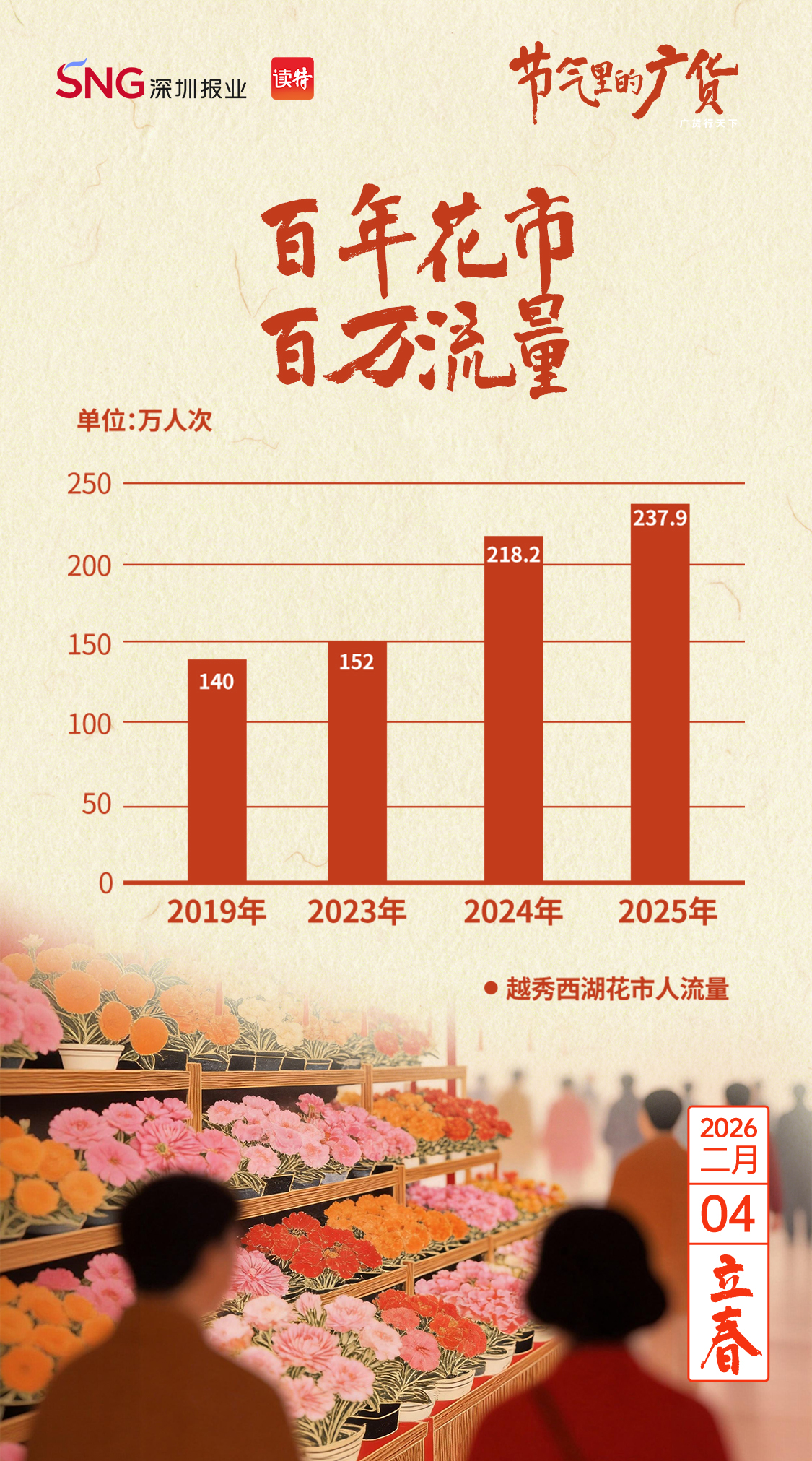 一百多年过去,这份刻在广东人DNA里的“仪式感”历久弥新。据报道,2025年,广州迎春花市的总营业额达1.19亿元,其中,有上百年历史的越秀西湖迎春花市开市4天,累计接待市民游客237.9万人次、同比增长9%,总销售额1578.1万元、同比增长4.6%,双双创历史新高。