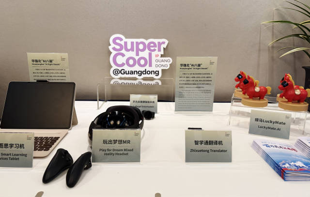 广东还把华强北“AI八骏”带到了开放日现场,记者在茶歇区体验了一把虚拟现实的互动装备MR机器,最吸引人的还是可以显示提词效果、实现同步摄录的AI眼镜,以及AI学习机、AI手表、AI翻译机等,都能大大提高工作和学习的效率。