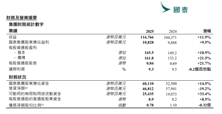 其中,2025年净利润包括一项因与香港飞机工程有限公司(HAECO)就飞机零件管理合营企业达成的和解协议而产生的非经常性盈利约8.78亿港元,此收入列于其他收入。