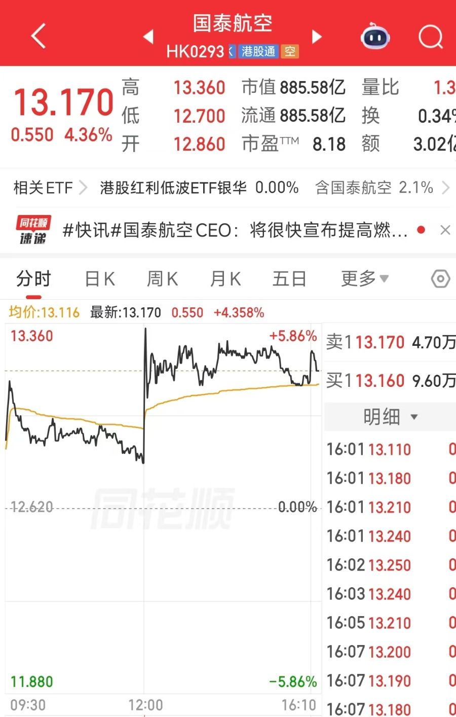 财报发布后,该公司股价大幅走强。截至3月11日收盘,国泰航空报13.17港元/股,涨幅4.36%,盘中涨幅一度超5%。