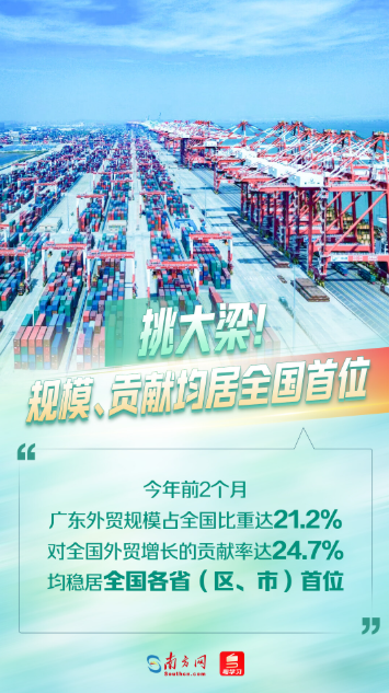 据海关总署广东分署统计,今年1—2月,广东外贸继续稳中有进,进出口1.64万亿元人民币,规模创历史同期新高,同比增长22.1%。另外,今年前2个月,广东外贸规模占全国比重达21.2%,对全国外贸增长的贡献率24.7%,均稳居全国各省(区、市)首位。目前,广东外贸进出口取得了哪些成绩?通过一组海报速览!